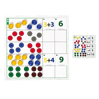Spelet riktar sig till barn som redan är kunniga på att räkna och kan koppla siffror till antal. Antal upp till 20 undersöks och räknas på olika sätt. Barnen lär sig att jämföra och strukturera olika antal så att räkningen blir enklare. I spelet ingår även självrättningskort. Innehåller 7 spelbräden, 70 kort, 7 självrättningskort, 3 tärningar, 360 spelpjäser i olika färger samt instruktioner. PVC-fri.