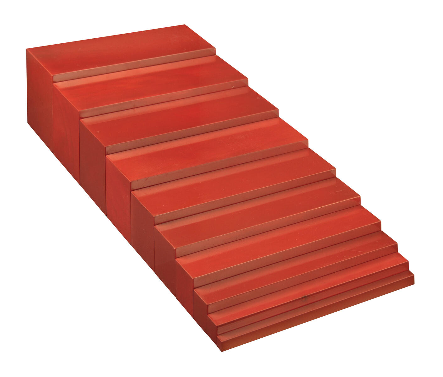 Breda trappan ger en förberedelse för matematik, bl.a. tränas ögat att se skillnader i två dimensioner, koncentrationsförmågan och handens muskler. Breda trappan består av 10 rektangulära prismor med samma längd (20 cm), men med varierande bredd och höjd, från 1x1x20 cm till 10x10x20 cm. Av trä, rödbrun färg.