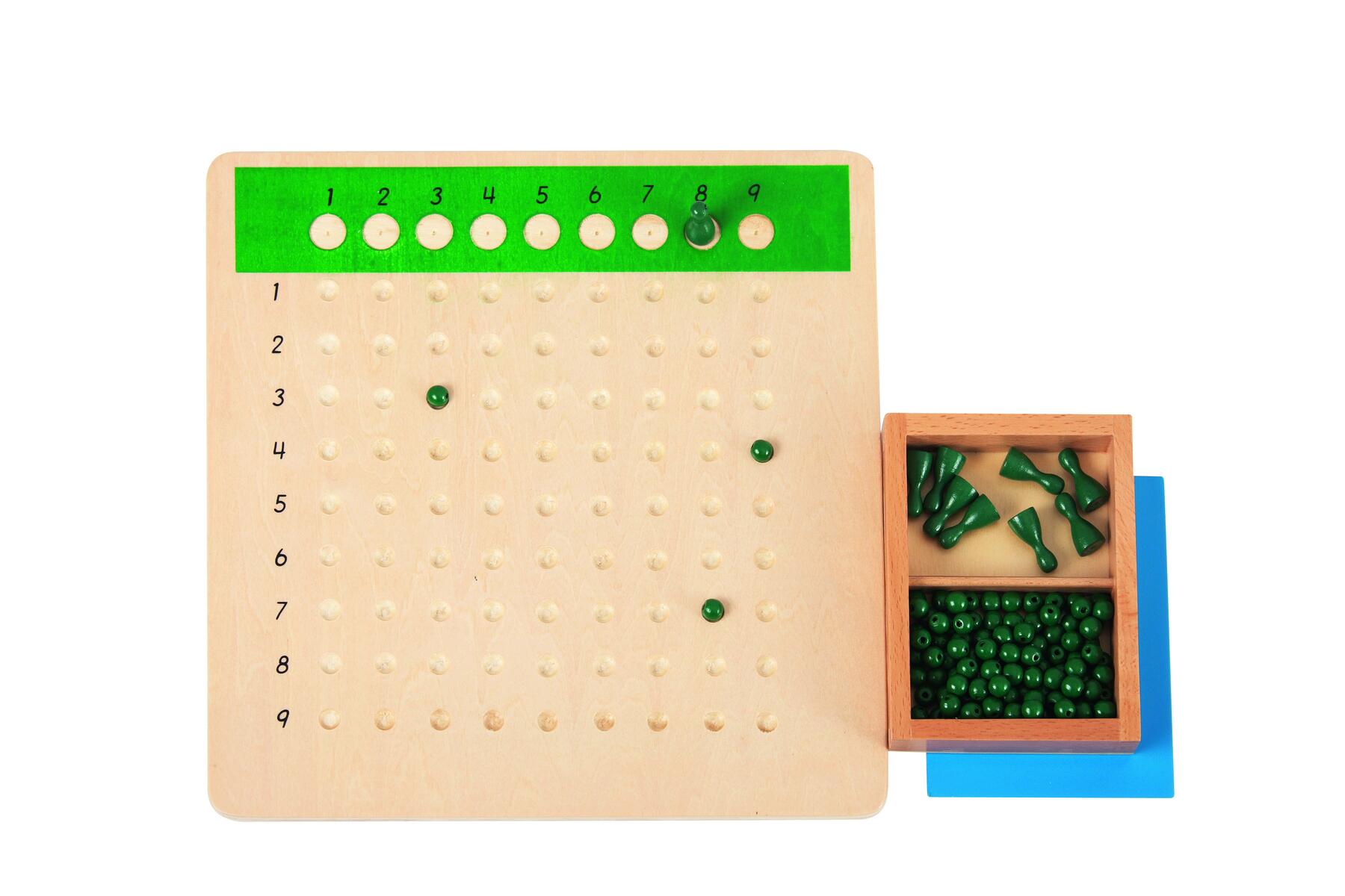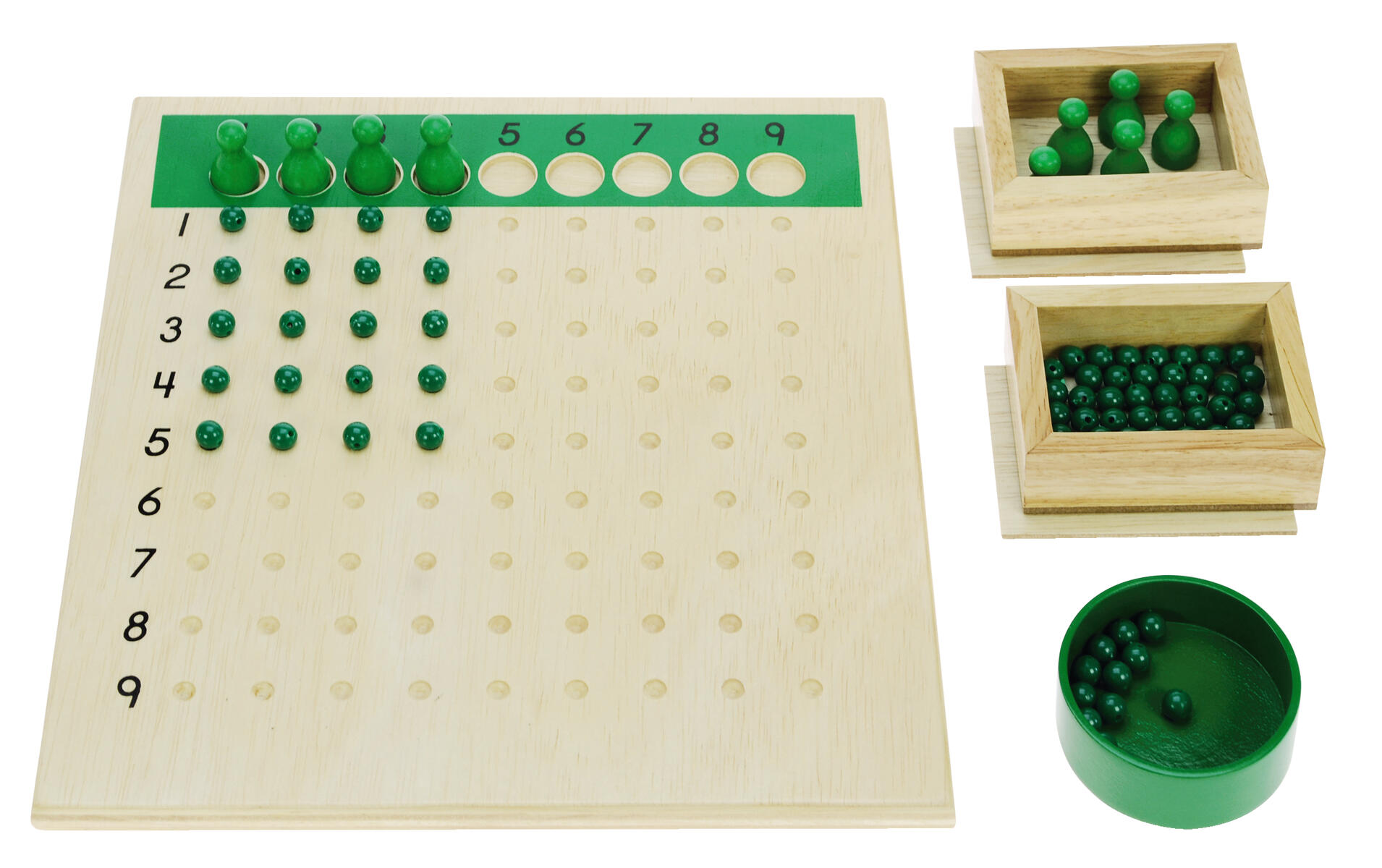 Bräde i trä med 100 små hål till pärlorna, 100 röda pärlor med tillhörande plastask och lock, kort med siffrorna 1–10 med tillhörande plastask och lock, en röd marker. Tränar multiplikation från 1x1 till 10x10. På ett konkret sätt ges en tydlig förståelse för vad multiplikation är när ett visst antal pärlor läggs upp rätt antal gånger. Talmönster visas och hantering av pärlorna tränar även upp finmotorik och koncentration. Från 5 år.