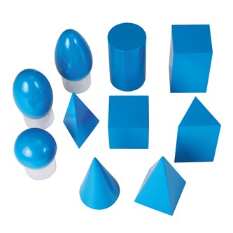 Gör barnet medvetet om de rymdgeometriska kroppar som finns runt omkring oss. Innehåller 10 blå massiva kroppar av trä och 3 hållare av trä. Kropparnas former är: cylinder, kub, ellipsoid, kon, klot, triangulär pyramid, kvadratisk pyramid, ovoid, rektangulärt prisma och triangulärt prisma.