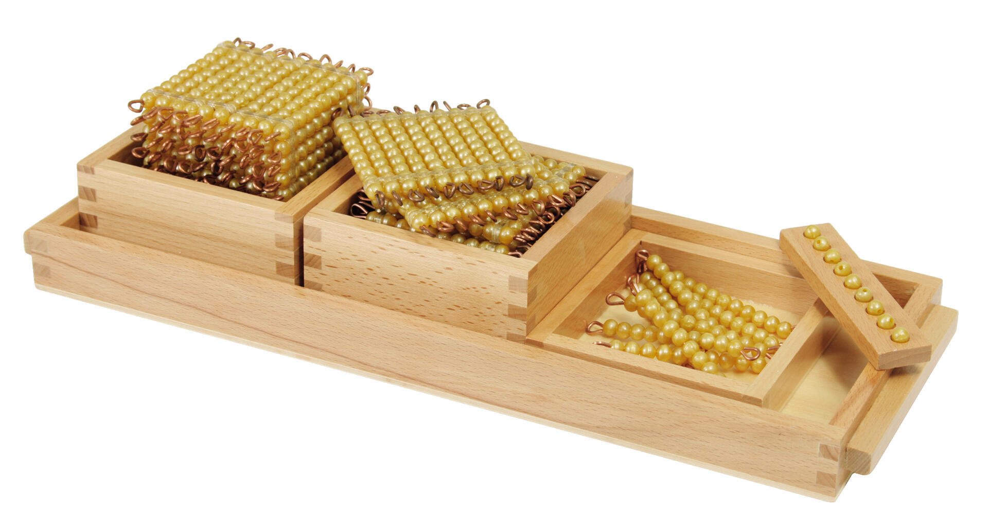 Setet består av 1 kub = 1000-tal, 9 kvadrater = 100-tal, 9 stavar = 10-tal, 9 lösa pärlor = 1-tal, 1 träbricka och 1 entalshållare av trä. Rörliga pärlor av plast.