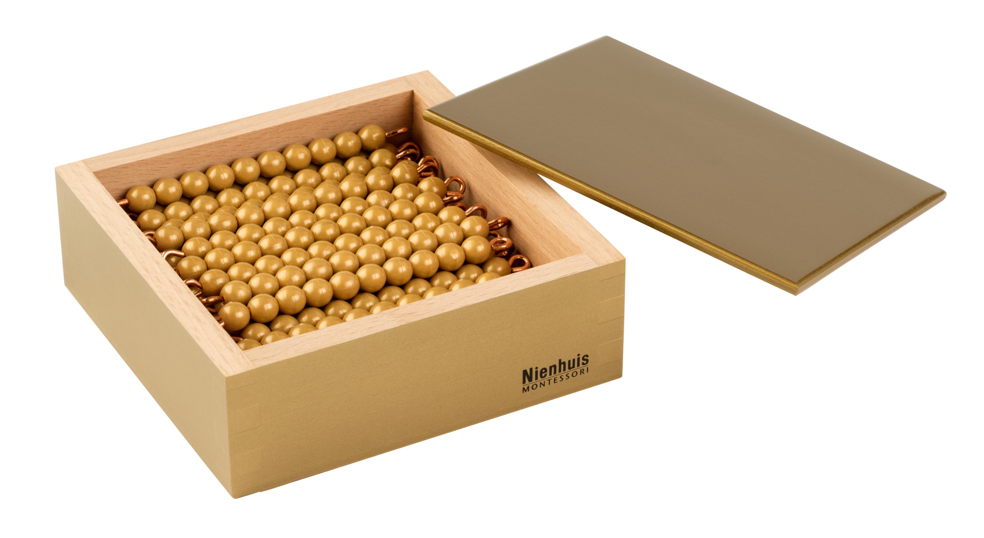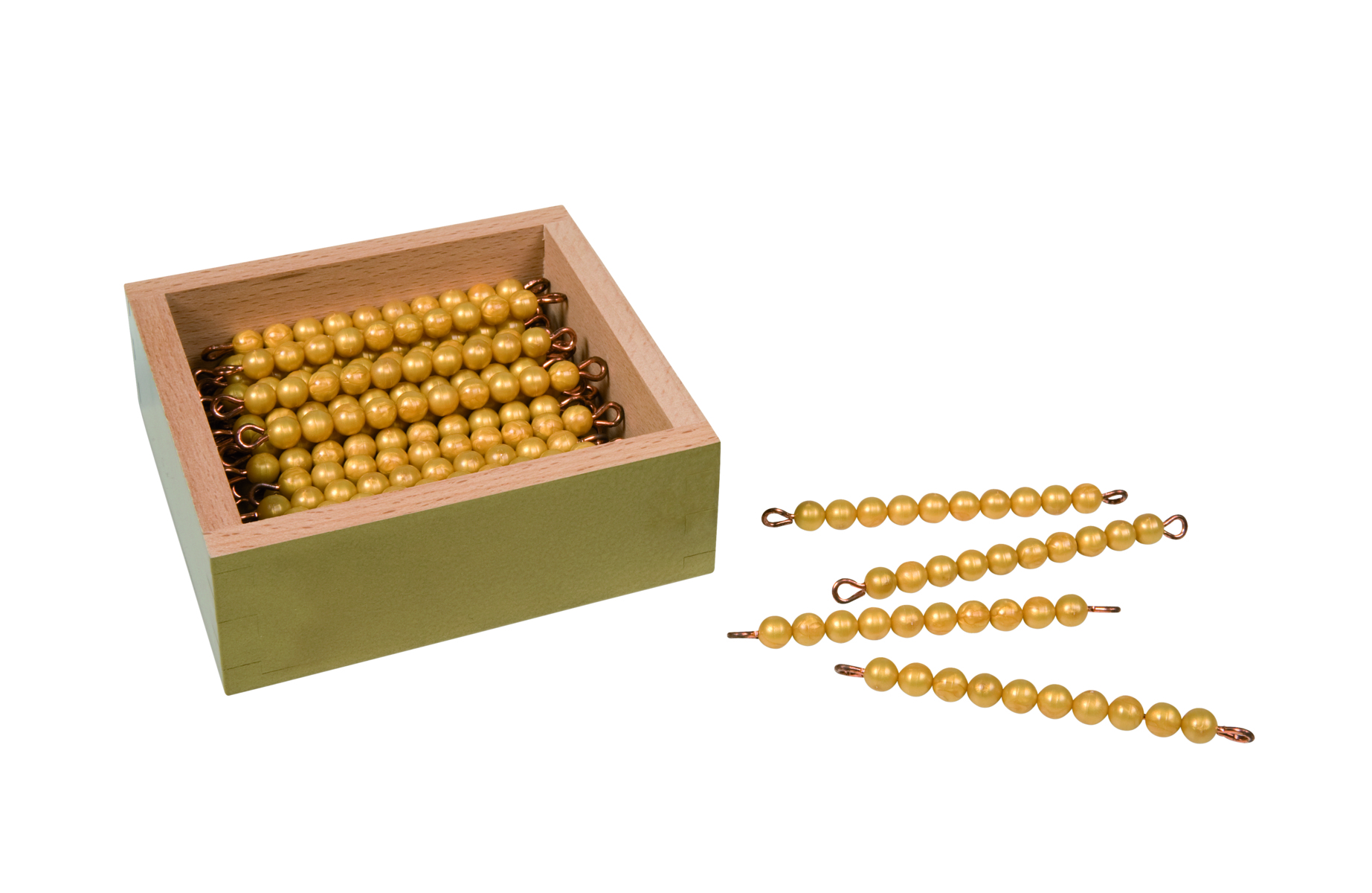 45 guldfärgade nylonpärlstavar om 10 pärlor vardera med guldfärgad trälåda samt tillhörande lock. Visar på ett konkret och tydligt sätt ett tiotal. Genom att känna och uppleva 10-pärlstaven i handen tränas muskelminnet kring hur mycket talet 10 är. Kombinerat med sifferkorten tränas att förknippa den konkreta kvantiteten med motsvarande tal. När man jämför 1000-kuben med 100-plattan, 10-talsstavar och entalsguldpärlor tränas positionssystemet. Från 6 år.