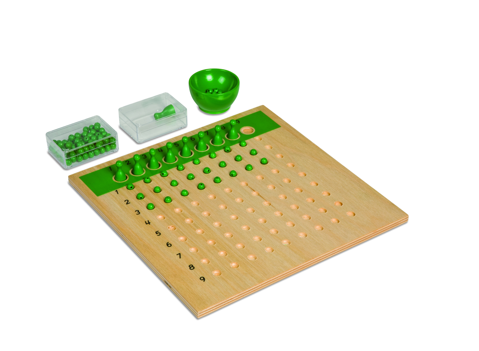 Bräde i trä med 100 små hål till pärlorna, 100 röda pärlor med tillhörande plastask och lock, kort med siffrorna 1–10 med tillhörande plastask och lock, en röd marker. Tränar multiplikation från 1x1 till 10x10. På ett konkret sätt ges en tydlig förståelse för vad multiplikation är när ett visst antal pärlor läggs upp rätt antal gånger. Talmönster visas och hantering av pärlorna tränar även upp finmotorik och koncentration. Från 5 år.