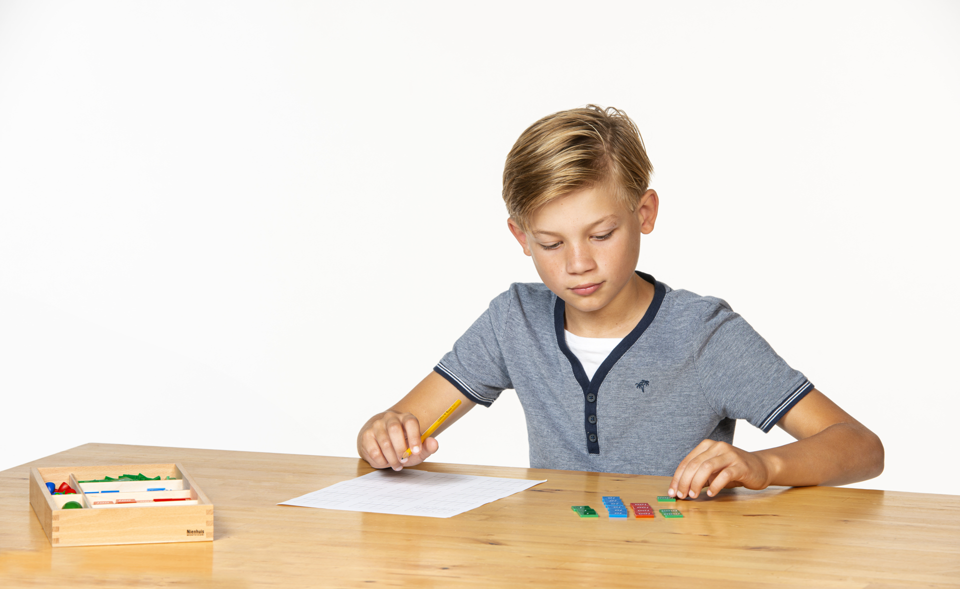 En trälåda som innehåller små träbrickor med gröna ental, blåa tiotal, röda hundratal och gröna tusental (1, 10, 100, 1 000 är tryckta på brickorna). Marker och käglor i samma färger. Konkret material för beräkningar i alla räknesätt. Barnet kan arbeta vidare med addition, subtraktion, multiplikation och division på egen hand. Materialet kan även användas till en grupp barn som ett växelspel tillsammans med en eller flera tärningar. Från 6 år.