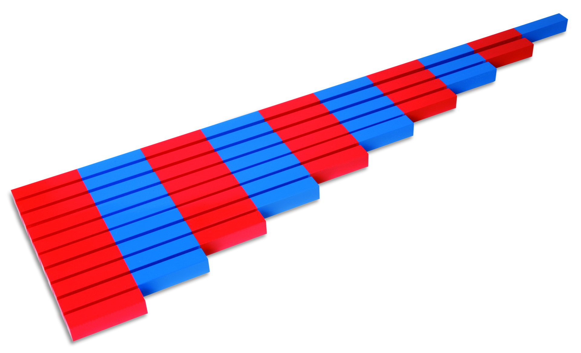 10 trästavar som varierar i längd från 10 cm till 100 cm. Varannan decimeter är färgad röd och varannan blå. Den första staven som är 10 cm (1 dm) är röd, den andra staven som är 20 cm (2 dm) är röd och blå o.s.v. Används för att lära ut namnen på talen 1 till 10 samt för att förknippa talens namn med rätt kvantitet. Tränar också motorik, dimensioner, mönster och ordning. Från 3 år.