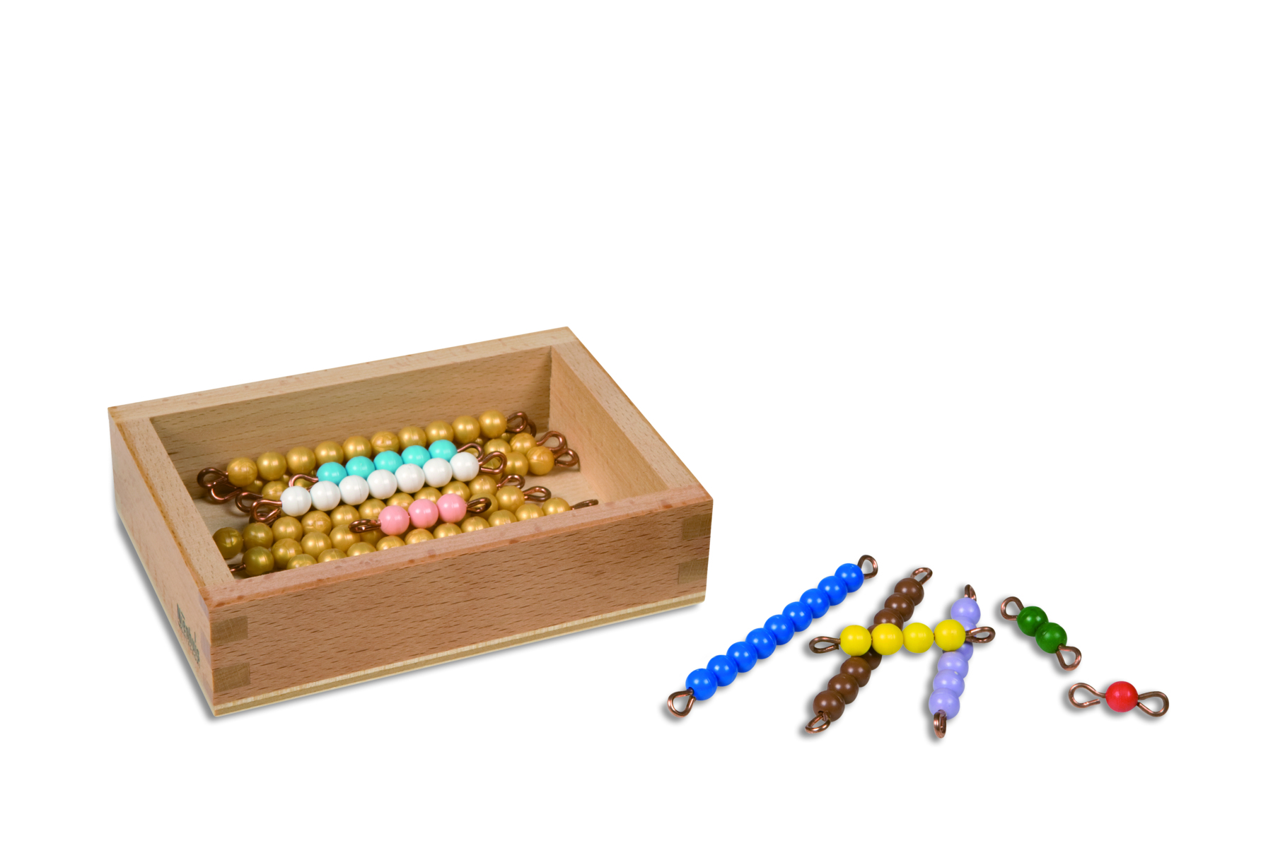 En trälåda som innehåller små träbrickor med gröna ental, blåa tiotal, röda hundratal och gröna tusental (1, 10, 100, 1 000 är tryckta på brickorna). Marker och käglor i samma färger. Konkret material för beräkningar i alla räknesätt. Barnet kan arbeta vidare med addition, subtraktion, multiplikation och division på egen hand. Materialet kan även användas till en grupp barn som ett växelspel tillsammans med en eller flera tärningar. Från 6 år.