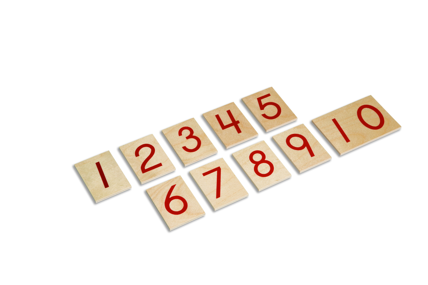 10 kort med siffrorna 1-10. Används för att lära ut namnen på talen 1 till 10 samt för att förknippa talens namn med rätt kvantitet. Kan användas tillsammans med räknestavarna. Siffrorna är tryckta i rött på fina träbrickor. Från 3 år.