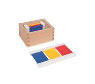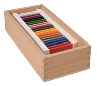 Färgspolarna, första lådan även kallad färglåda 1. Utvecklar barnets intresse för färger. Tränar färgernas namn och förbereder för arbete med bild och konst. Består av 2 spolar vardera av färgerna röd, blå och gul, totalt 6 spolar samt en förvaringslåda av bokträ. Mått: L9xB8xH5 cm. Från 3 år.