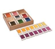Färgspolarna, tredje lådan även kallad färglåda 3. Utvecklar barnets intresse för färger. Tränar färgernas namn och förbereder för arbete med bild och konst. Utvecklar förmågan att gradera efter färgnyans och även ordningssinne och motorik. Består av 9 olika färger med vardera 7 nyanser, totalt 63 spolar. Färgerna är röd, blå, gul, grön, lila, orange, brun, rosa, grå samt en förvaringslåda av bokträ med 9 små fack. Mått: L32xB26xH7 cm. Från 3 år.