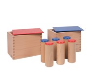 Består av 2 trälådor, som var och en innehåller 6 träcylindrar (dosor) med röda respektive blå lock. När cylindrarna skakas ger de ifrån sig olika ljud från mjukt, lågt ljud till högre. 6 olika ljud. Utveckla förmågan att höra skillnad på olika ljud och främja intresset för ljud i omgivningen. Träna genom att gradera ljud på olika sätt, namnge ljud (starkt-svagt) samt para ihop röda respektive blå dosor som låter likadant. Ljuddosorna är förseglade. Mått på lådorna: L23xB14xH12 cm. Från 3 år.