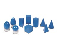 10 blå, geometriska, solida kroppar samt 3 genomskinliga hållare till objekten med rund sida. Utveckla förmåga och känsla för olika geometriska former vilket också leder till ökad uppfattningsförmåga av lika eller liknande former i omgivningen. Tränar matematik och geometri. Massiva objekt av trä. Kropparnas former är: cylinder, kub, ellipsoid, klot, ovoid, kon, pyramid med triangelbas, pyramid med kvadratisk bas, prisma med triangelbas, prisma med kvadratisk bas (rätblock). Mått: Höjden på de högsta formerna är 10 cm. Kubens sida är 6 cm. Från 3 år.