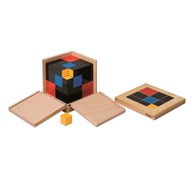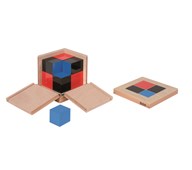 Trinomiala kuben även kallad trinomen. 27 träkuber/träprismor lackerade i rött, svart, blått och gult. Övar förmågan att se skillnad i 3 olika dimensioner, tränar uppfattning av matematiska mönster och förbereder för arbete med algebra. Kan användas med yngre barn som ett pussel men ger också en konkret upplevelse av ekvationen (a+b+c)³. Kuben förvaras i en trälåda med lock där 2 sidor är nedfällbara. Från 4 år.