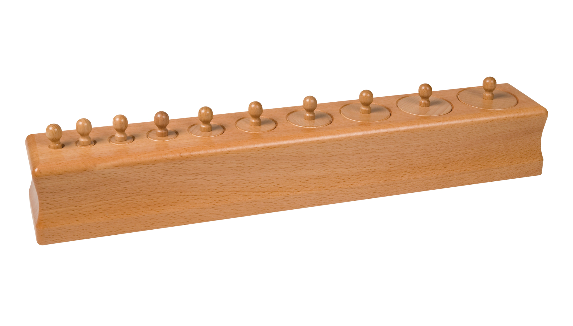 Innehåller 4 lådor med 4 set cylindrar av trä. Varje set har sin färg och sina dimensioner. Utvecklar ögats och handens känsla för dimensioner, tränar rumsuppfattning och uppmuntrar till observation av omgivningen. Tränar förmågan att kunna urskilja även små skillnader i storlek. Finmotorik och koordination utvecklas. Varje set av cylindrar förvaras i lådor av bokträ där locket är målat i samma färg som cylindrarna. Från 3 år.
