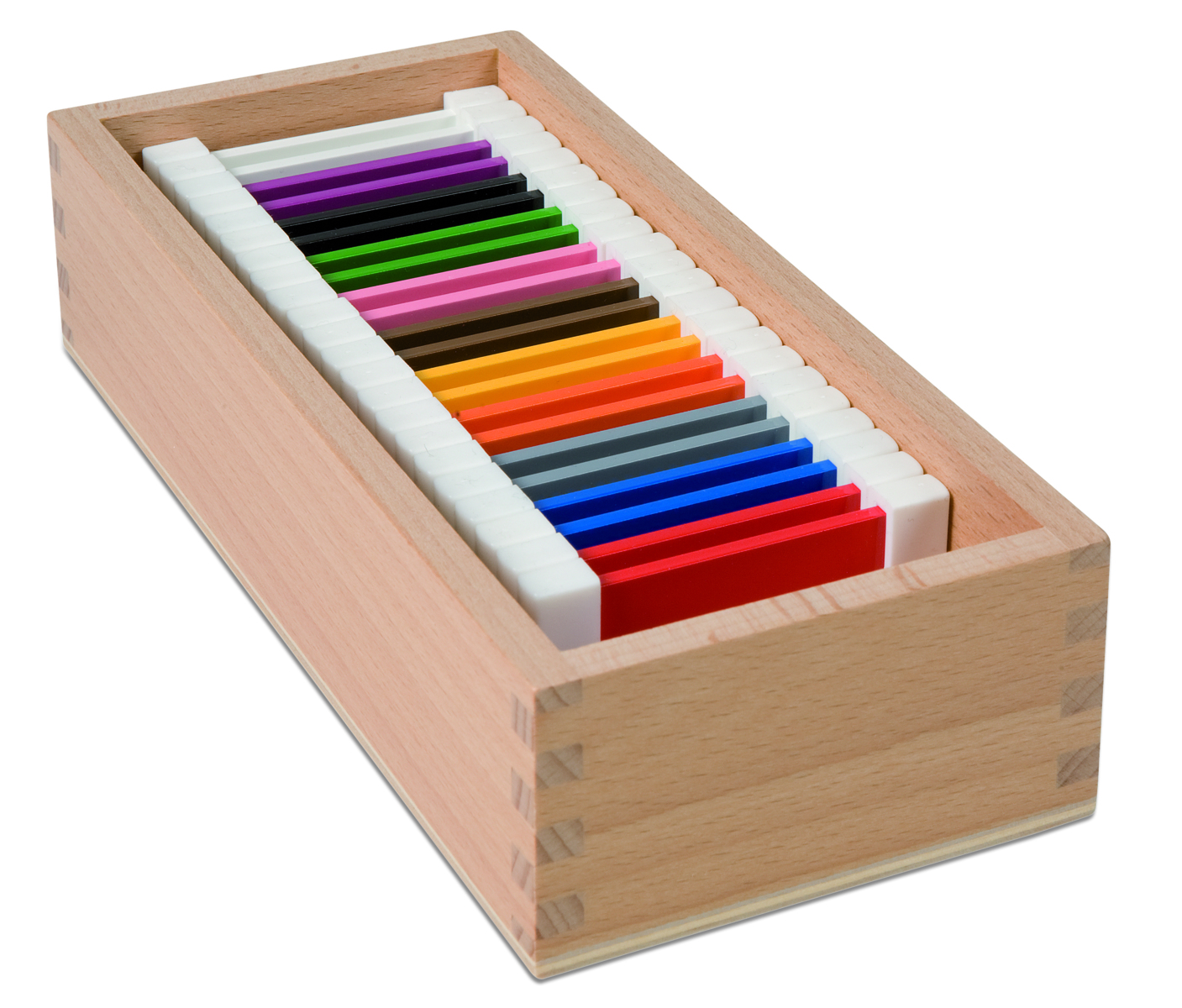 Färgspolarna, tredje lådan även kallad färglåda 3. Utvecklar barnets intresse för färger. Tränar färgernas namn och förbereder för arbete med bild och konst. Utvecklar förmågan att gradera efter färgnyans och även ordningssinne och motorik. Består av 9 olika färger med vardera 7 nyanser, totalt 63 spolar. Färgerna är röd, blå, gul, grön, lila, orange, brun, rosa, grå samt en förvaringslåda av bokträ med 9 små fack. Mått: L32xB26xH7 cm. Från 3 år.