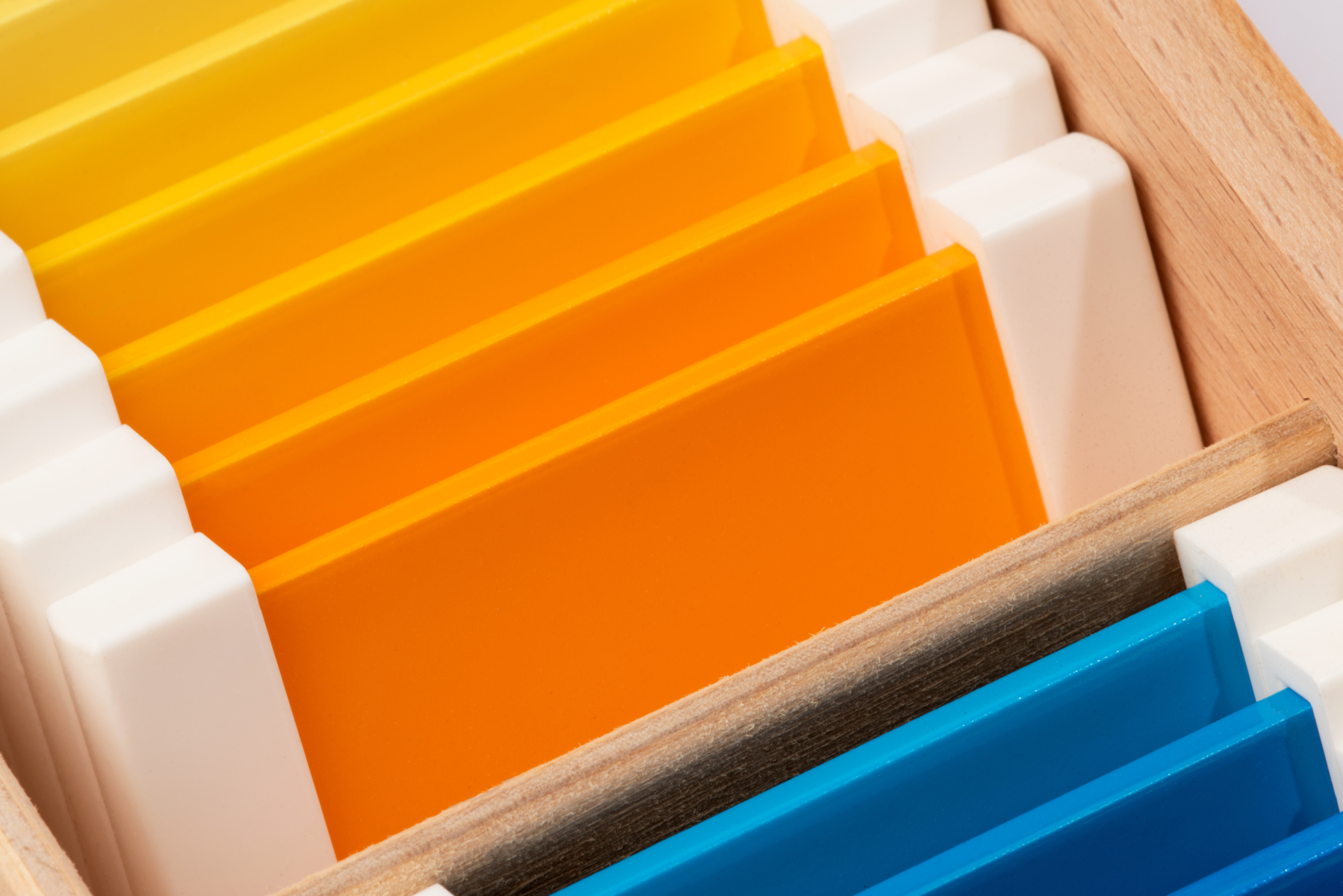 Färgspolarna, första lådan även kallad färglåda 1. Utvecklar barnets intresse för färger. Tränar färgernas namn och förbereder för arbete med bild och konst. Består av 2 spolar vardera av färgerna röd, blå och gul, totalt 6 spolar samt en förvaringslåda av bokträ. Mått: L9xB8xH5 cm. Från 3 år.