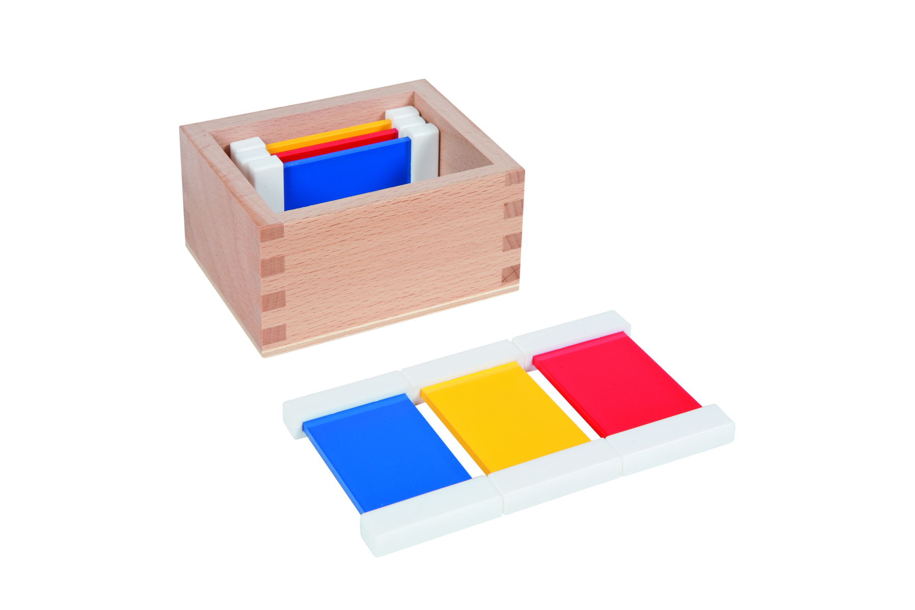 Färgspolarna, första lådan även kallad färglåda 1. Utvecklar barnets intresse för färger. Tränar färgernas namn och förbereder för arbete med bild och konst. Består av 2 spolar vardera av färgerna röd, blå och gul, totalt 6 spolar samt en förvaringslåda av bokträ. Mått: L9xB8xH5 cm. Från 3 år.
