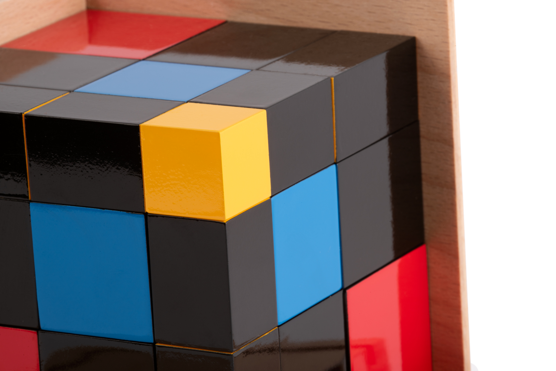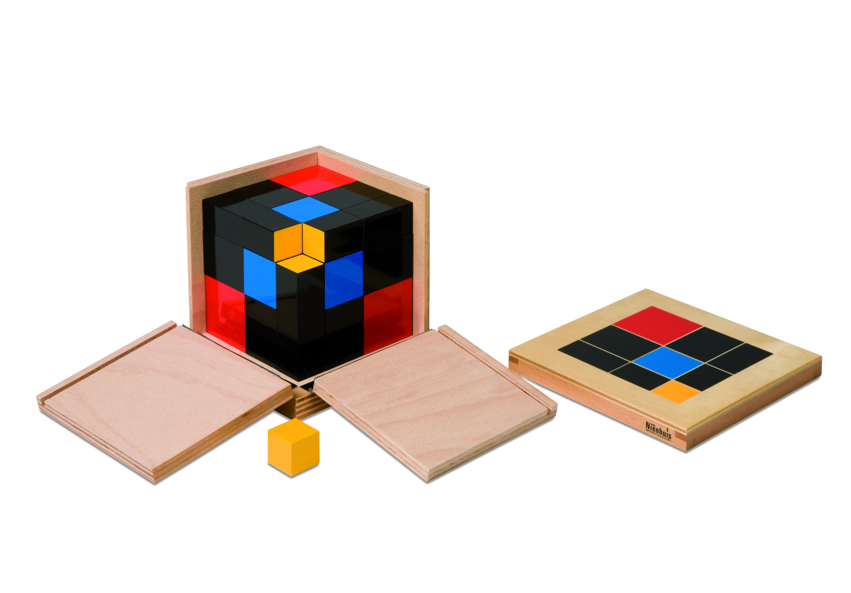 Trinomiala kuben även kallad trinomen. 27 träkuber/träprismor lackerade i rött, svart, blått och gult. Övar förmågan att se skillnad i 3 olika dimensioner, tränar uppfattning av matematiska mönster och förbereder för arbete med algebra. Kan användas med yngre barn som ett pussel men ger också en konkret upplevelse av ekvationen (a+b+c)³. Kuben förvaras i en trälåda med lock där 2 sidor är nedfällbara. Från 4 år.