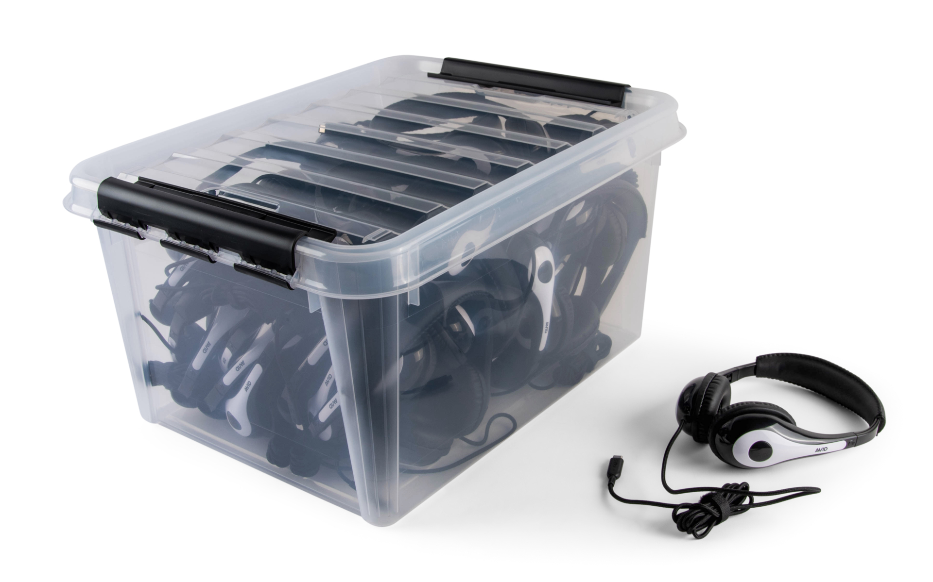 30 st AE-54 hörlurar i förvaringslåda. Praktiska och tåliga hörlurar med ljudreducerande öronkåpor med minimalt ljudläckage. Tuggresistent kabel med förstärkta kabelinfästningar. På varje sladd sitter ett litet kardborreband för att sladdarna lätt ska kunna rullas ihop och förvaras enkelt utan trassel. Från 5 år.