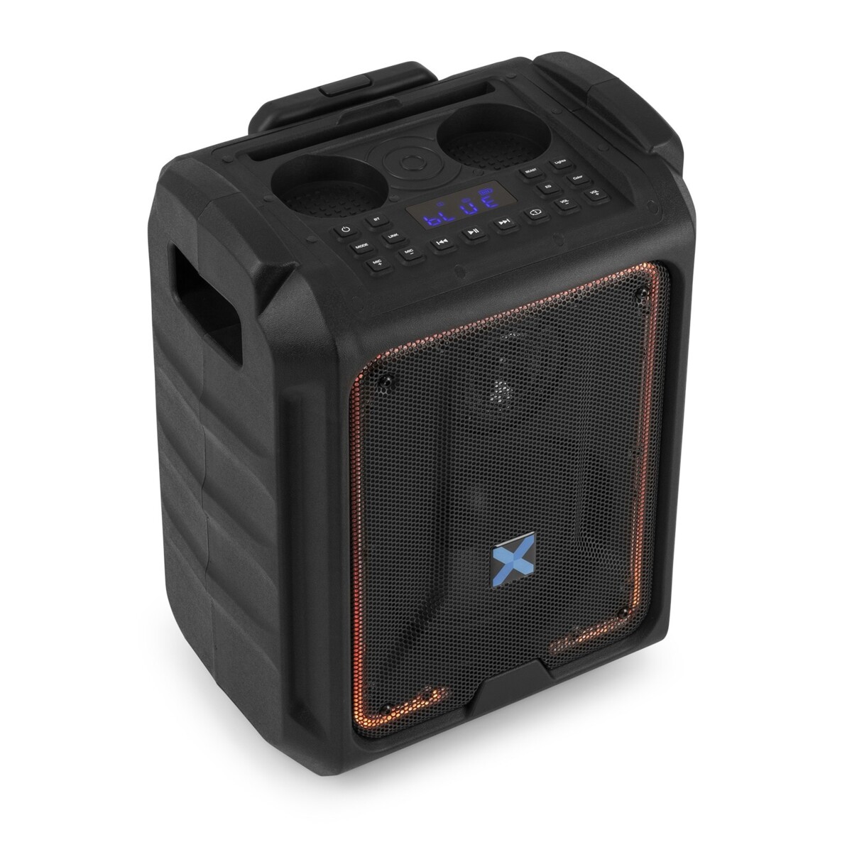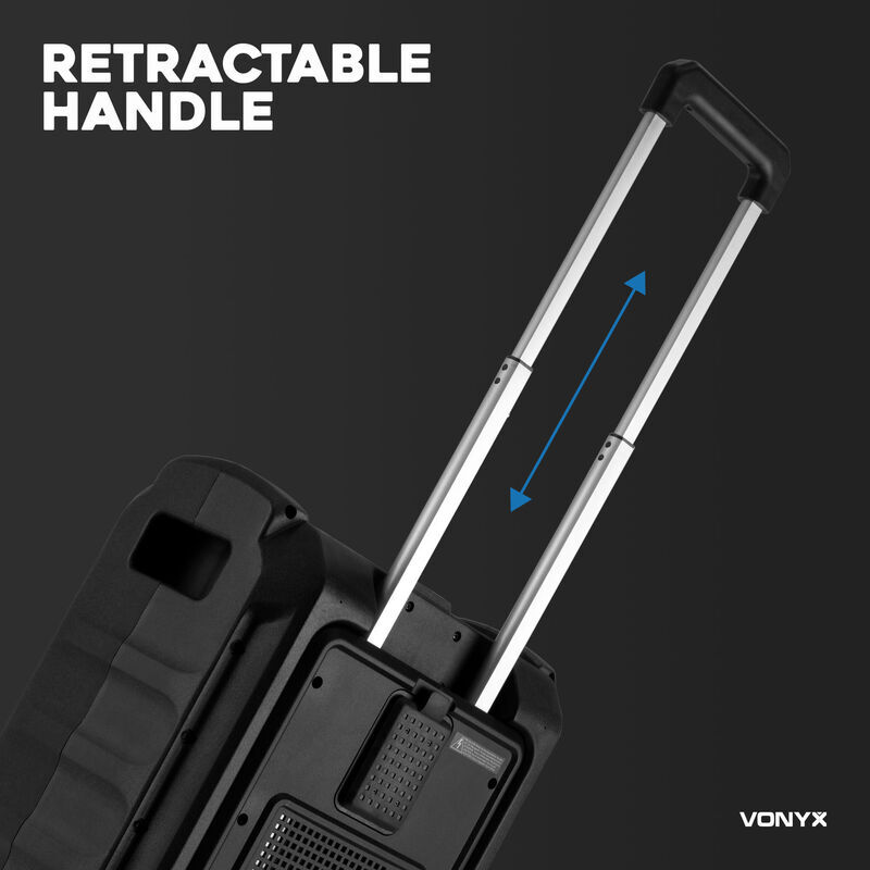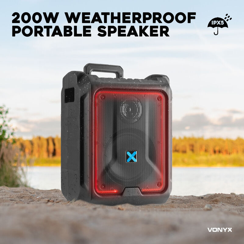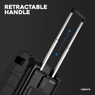 Ett trådlöst, väderbeständigt allt-i-ett-ljudsystem med IPX5-klassificering för inom- och utomhusbruk. Kraftfullt ljud tack vare 2-vägs högtalarsystem med 8" bashögtalare och 3" diskanthögtalare. Inbyggt uppladdningsbart litiumjonbatteri som håller upp till 10 timmar mellan laddningarna. Bär i handtag eller dra ut teleskophandtaget och dra på hjulen. Ingångsanslutningar: 3,5 mm, RCA, USB, Bluetooth. 6,3 mm mik in. Vår mikrofon 141150 passar. Mått: L37xB27xH50 cm. Vikt 9,85 kg.