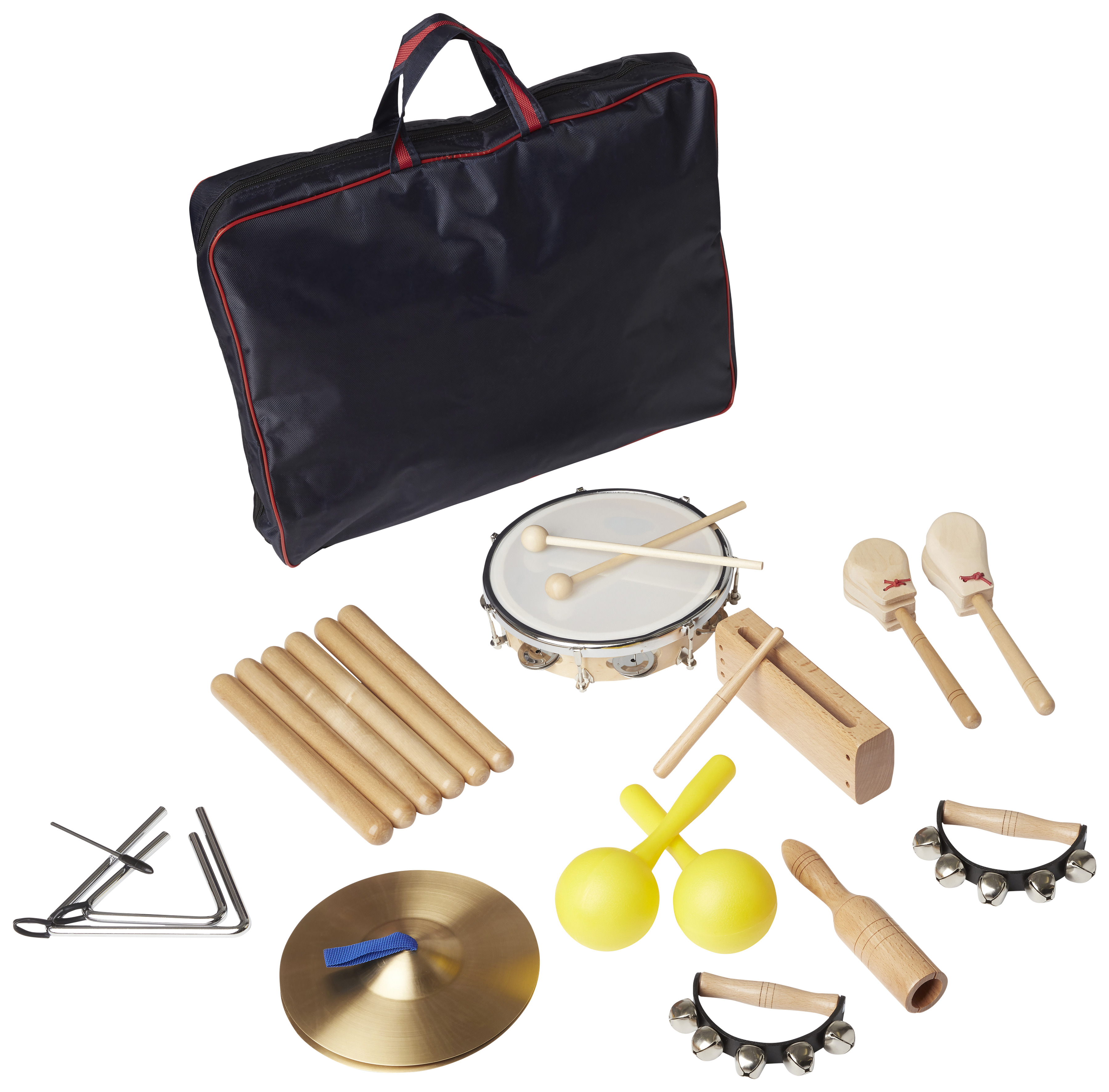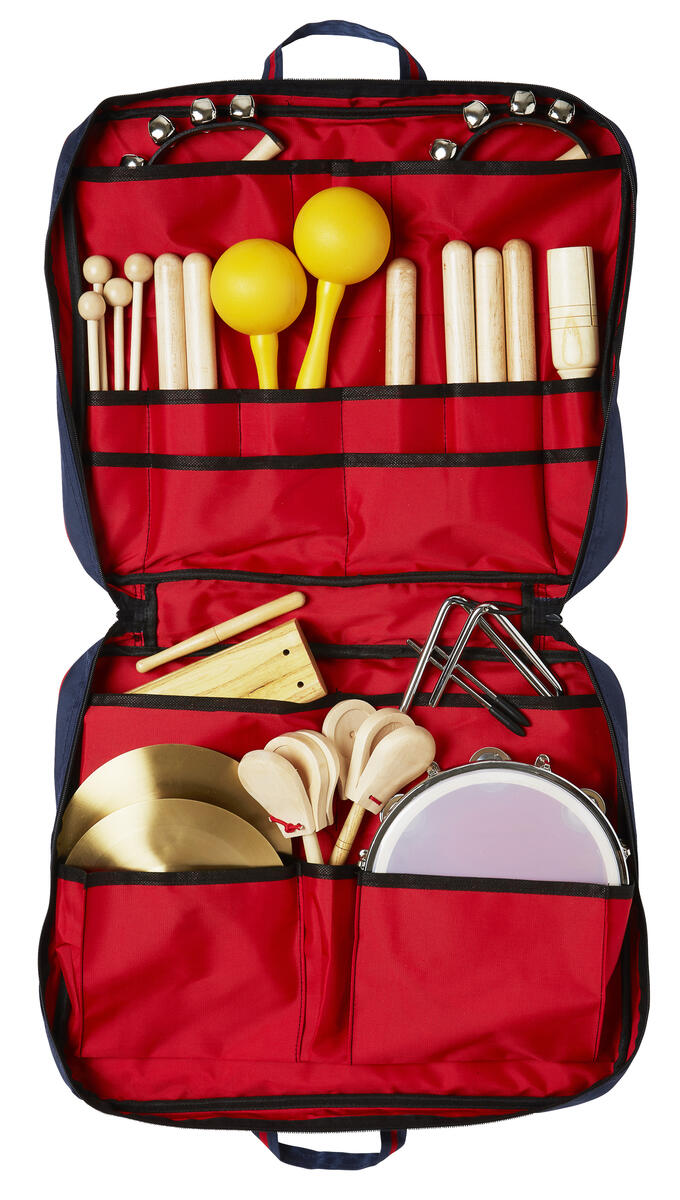 Tio olika instrument förpackade i en genomskinlig väska. Innehåller: tamburin, triangel, 2 maraccas, 2 kastanjetter, 2 claves, rytmklappa, guiro (gurka) med slagträ, 2 fingercymbaler, rasselpinne och bjällerskallra. Från 3 år.