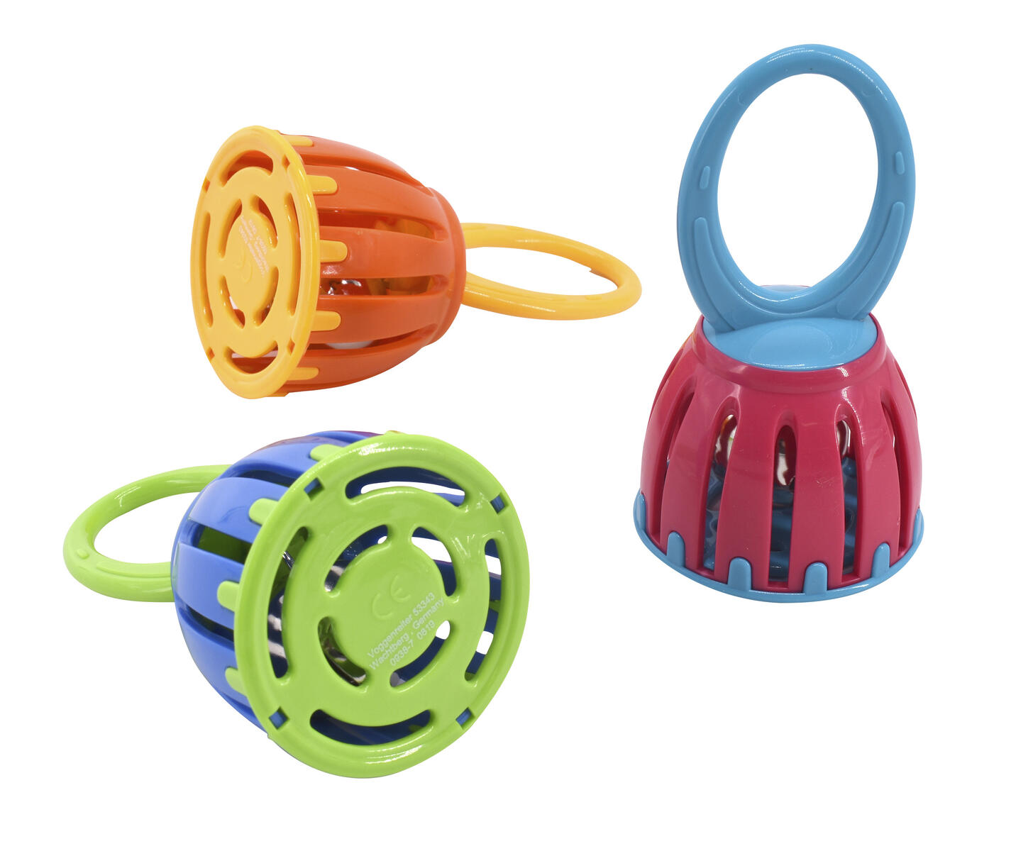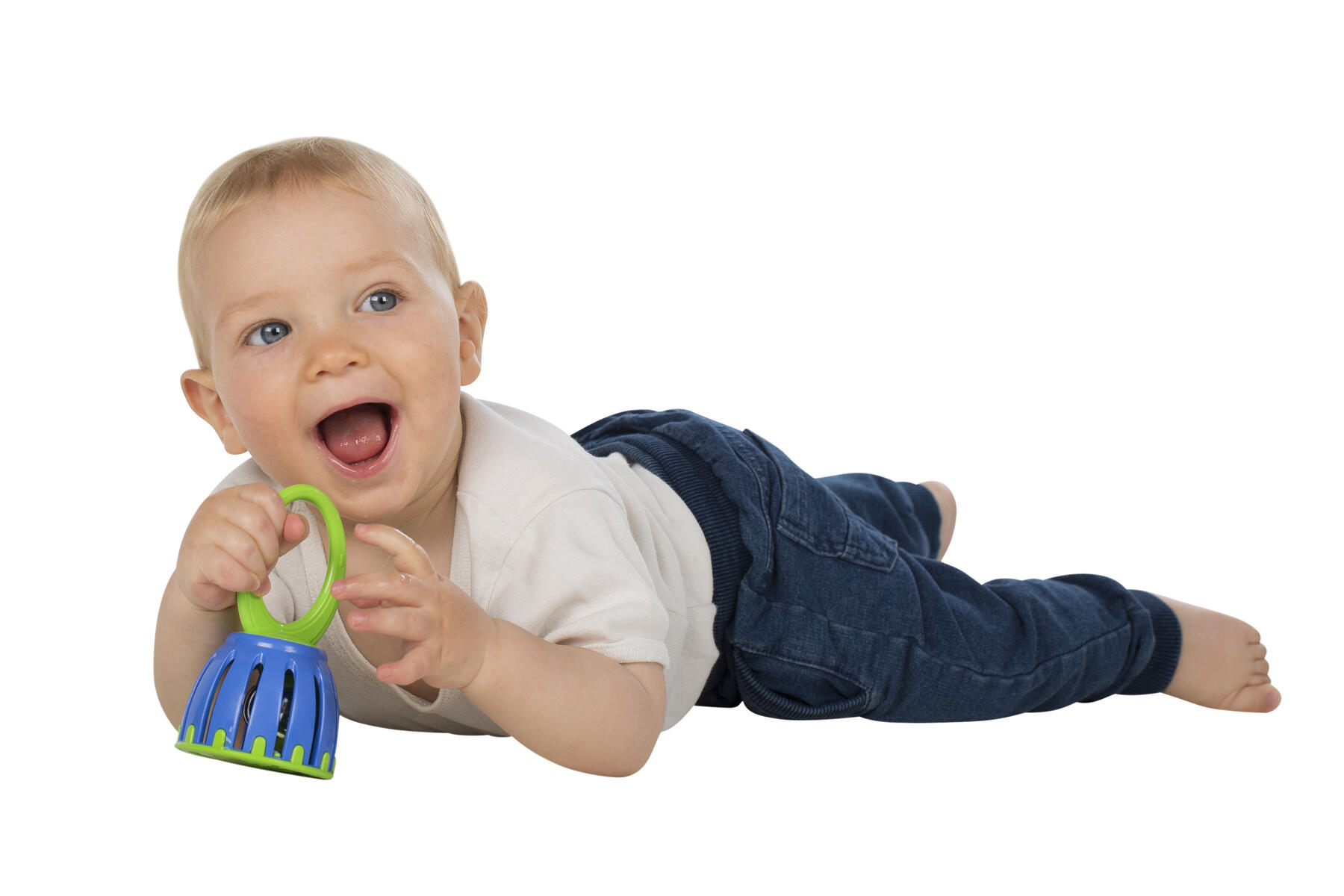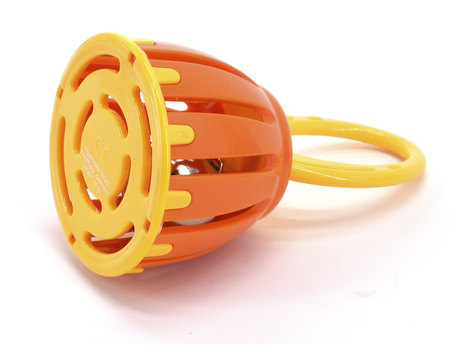 Denna skallra fångar barnens intresse med olika strukturer och starka färger. Lätt att greppa och att böja och vrida. Ett mjukt skallrande ljud. Längd 16 cm. Av ABS, EVA, POM. PVC-fri. Från 3 månader.