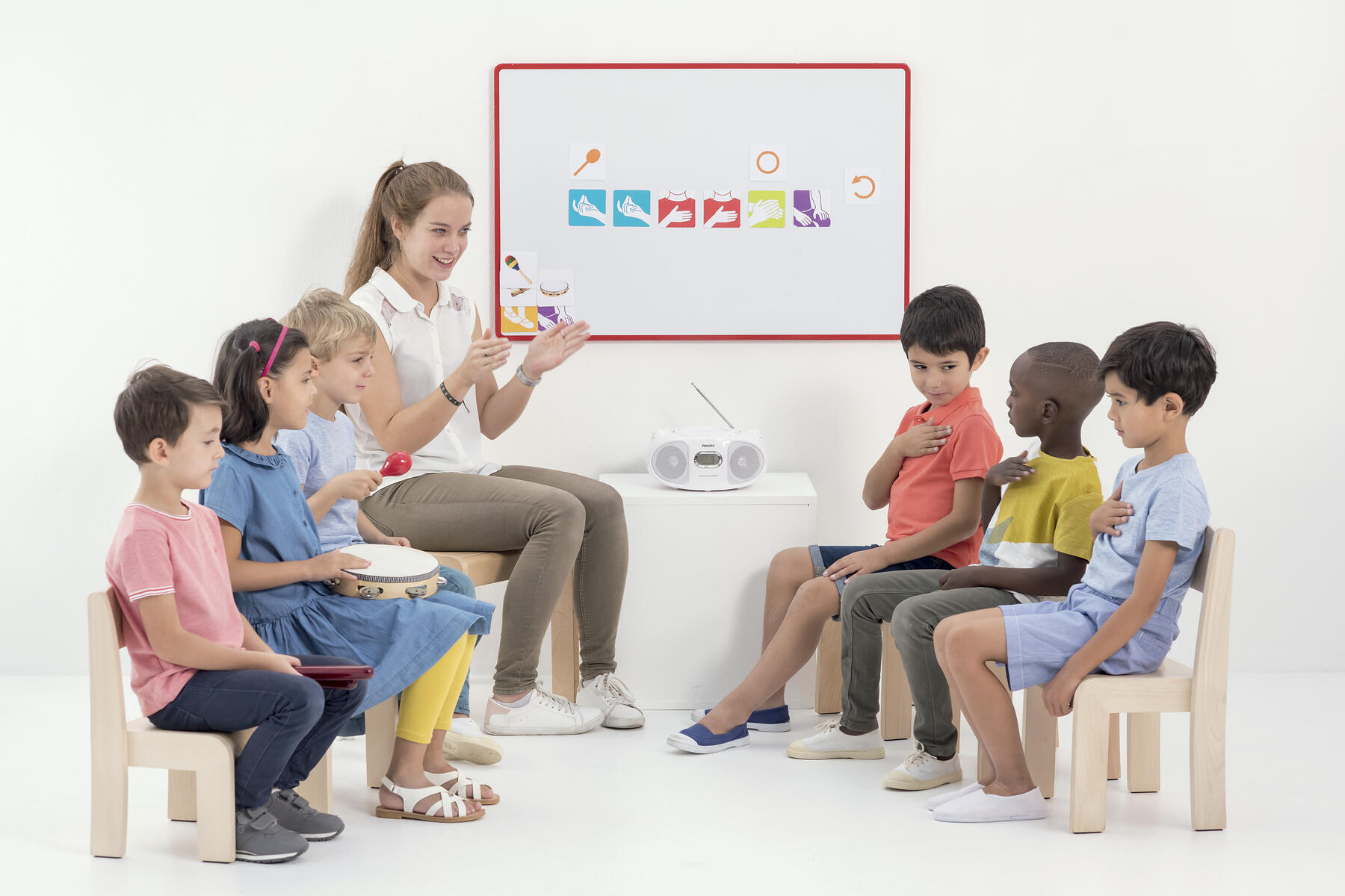 Låt barnen lyssna på ett musikstycke och förklara vad de hörde och kände genom att sätta de magnetiska bilderna på den magnetiska tavlan. Tavlan är uppdelad i olika färgsektioner: musikens ursprung (instrument eller sång), intensitet (låg/hög), tempo (lågt/högt) och personligt tyckande. Innehåller en CD med 11 olika musikstycken och 40 magnetiska kort samt en tavla. PVC-fri. Från 3 år.