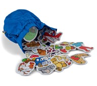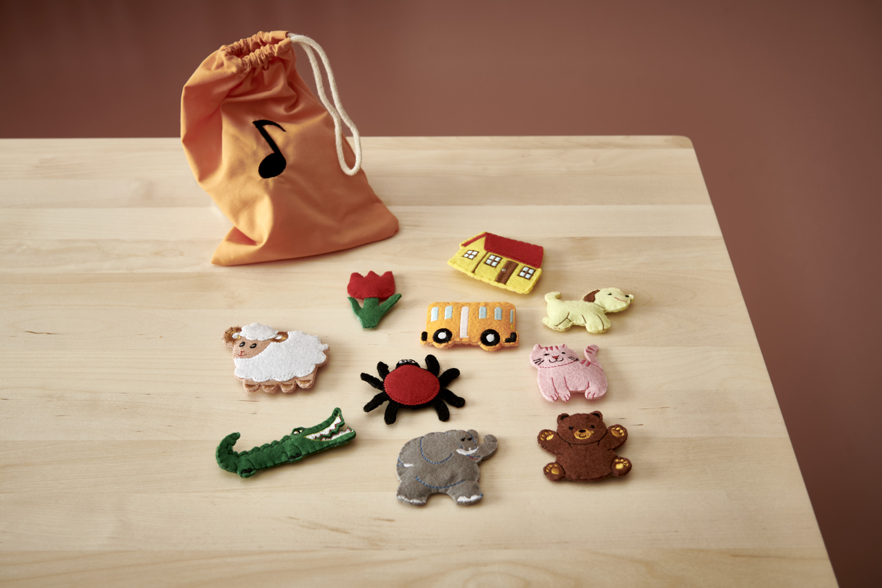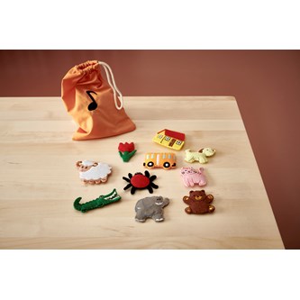 En påse med dragsko innehållande 10 olika mjuka figurer som kan användas till sångförslag. Barnen sticker ner handen i påsen och efter att ha tagit upp en figur försöker de komma på en sång som handlar om just detta djur eller sak. Påsen innehåller elefant, spindel, björn, hund, hus, lamm, katt, buss, blomma och krokodil. Med kardborre på baksidan om man vill sätta upp djuret på t.ex. en flanellograftavla. Mått på figurer ca 7 cm. Av polyester. PVC-fri.