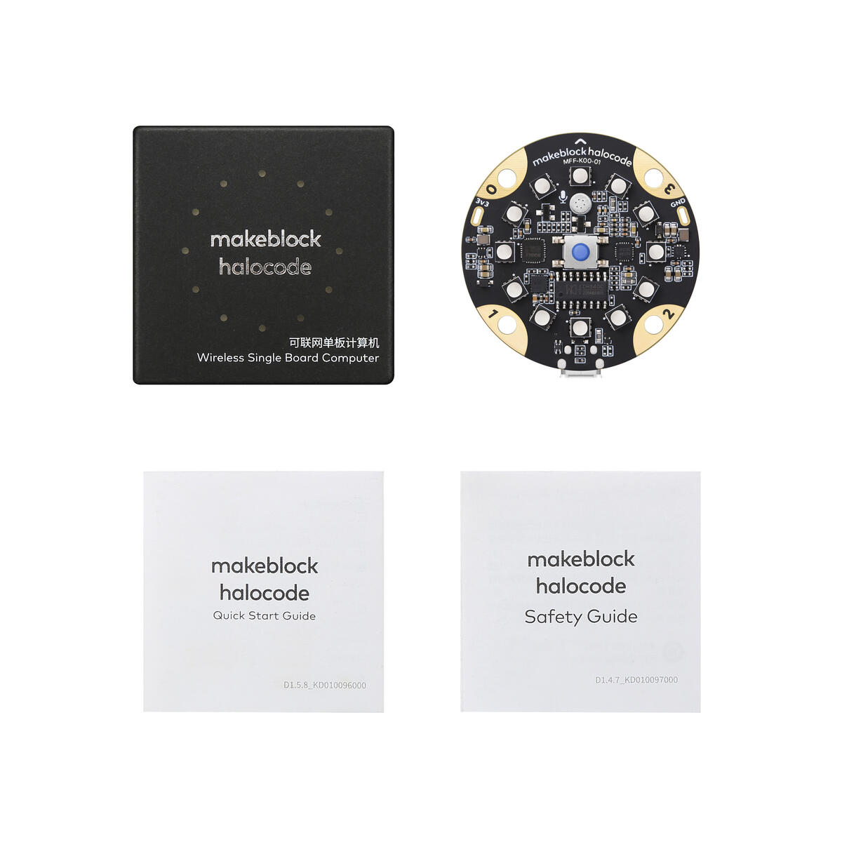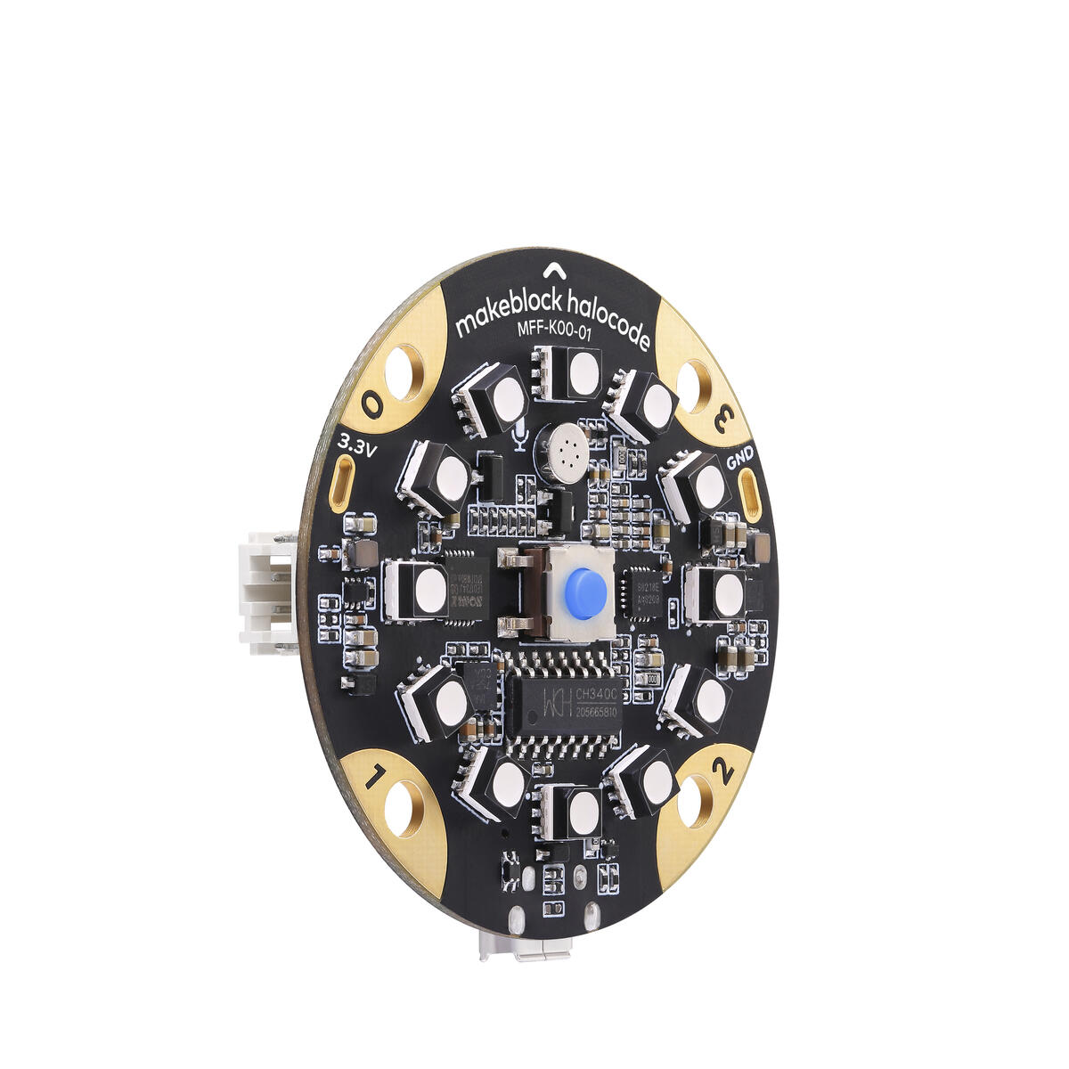 Halocode är en liten enkortsdator för programmering, teknik och ellära i skolan.Programmeras i mBlock5 som bygger på blockprogrammering i Scratch 3.0, även textprogrammering i Python. Specifikationer: Wifi-/Bluetooth-anslutningar, Micro-USB, seriell port, 12 RGB LED-dioder, rörelsesensor, mikrofon, 4 beröringssensorer. Mått: ø 4,5 cm, vikt 10 g. App/programvara: mBlock 5 för Win7 eller Win 10 samt macOS 10.12+, mBlock för Android 6.0+, IOS 10.0+. mBlock webbversion.