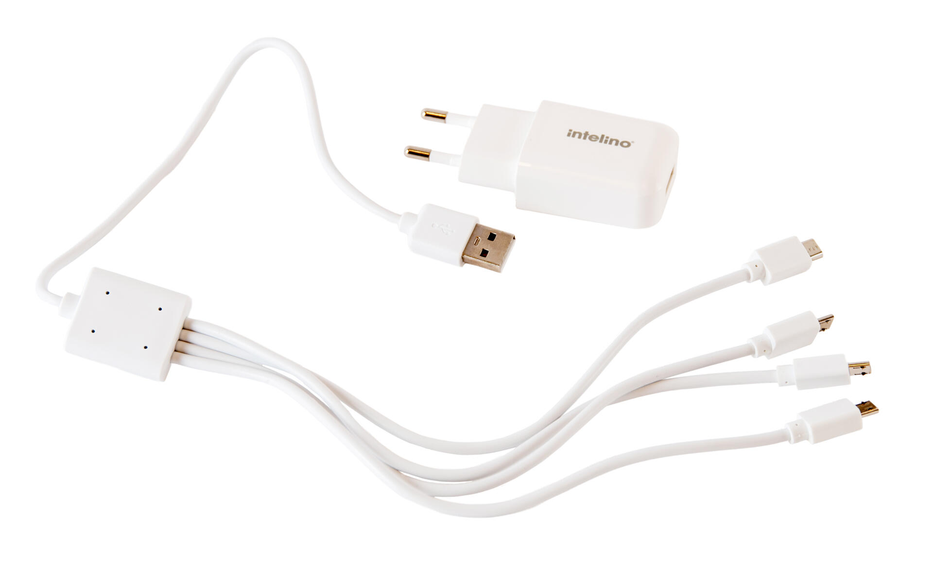 Extra USB-laddningskabel (A-kontakt) med fyra micro-USB -utgångar (gäller den äldre micro-USB standarden, ej USB-C), kopplad till en väggladdningsadapter. Avsedd för att ladda upp flera av tågen i Intelino Smart Train-serien samtidigt.