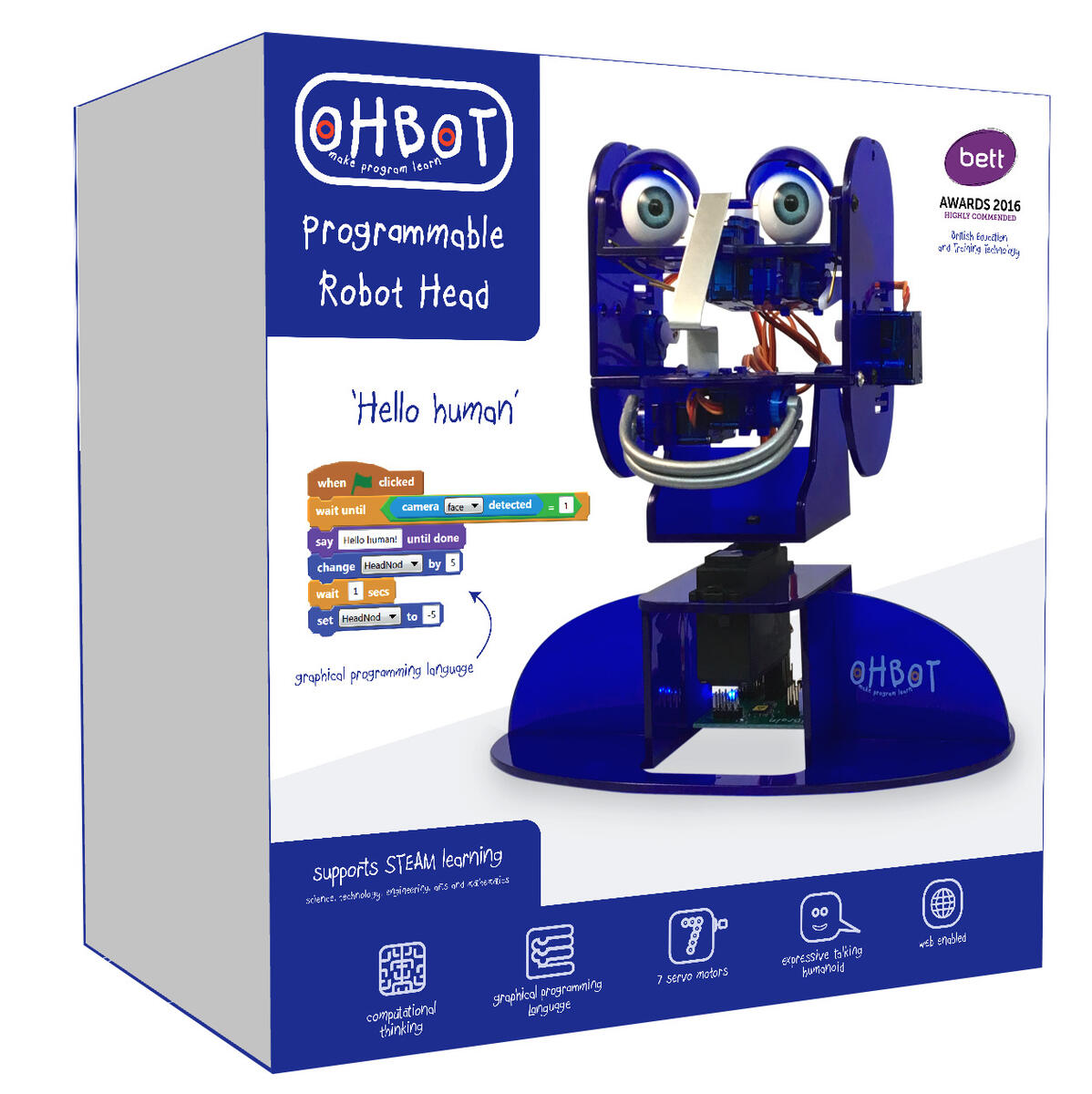 Genom att programmera de sju motorerna kan man få Ohbot att röra på huvudet, blinka, röra läpparna och prata. Programmeringen utförs i ett grafiskt programmeringsspråk baserat på Scratch. Det finns även möjlighet att koppla till olika sensorer samt kamera för att t.ex. registrera ljus, rörelse och känna igen ansikten. Genom att programmera Ohbot tränas bl.a. datalogiskt tänkande och förståelse för sekvenser och variabler. Levereras färdigmonterad med programvara och licens för 4 användare och en dubbel USB-kabel. Ansluts till dator med Win7 eller senare.