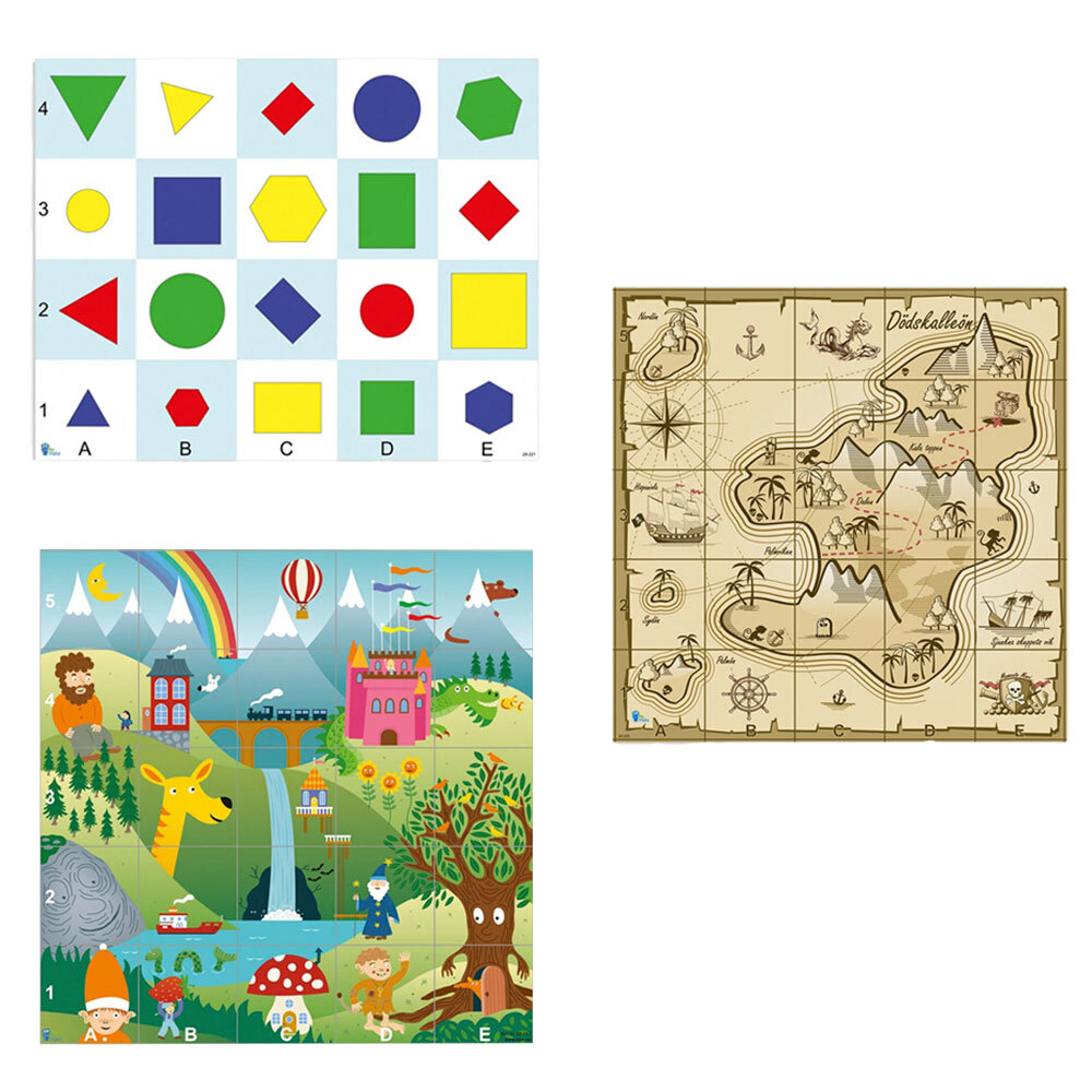 3 st/fp. Mattor till de programmerbara robotarna Bee-Bot och Blue-Bot. Tre olika teman: geometri, fantasi och skattkarta. Perfekta för att öva teknik, språk, samarbete och problemlösning. Utrullad matta är helt plan mot underlaget. Svensktillverkad, flamsäker och fri från giftiga ftalater. Varje ruta motsvarar 15 cm. Mått: geometri 60x75 cm, fantasi och skattkarta 75x75 cm. Av polyester som är belagd med PVC-fri plastfilm för att tåla väta.