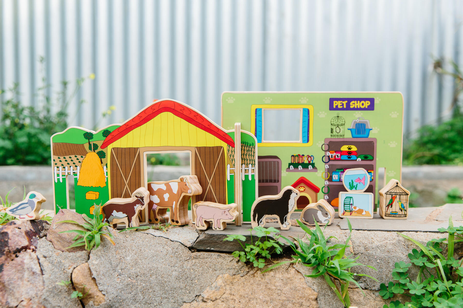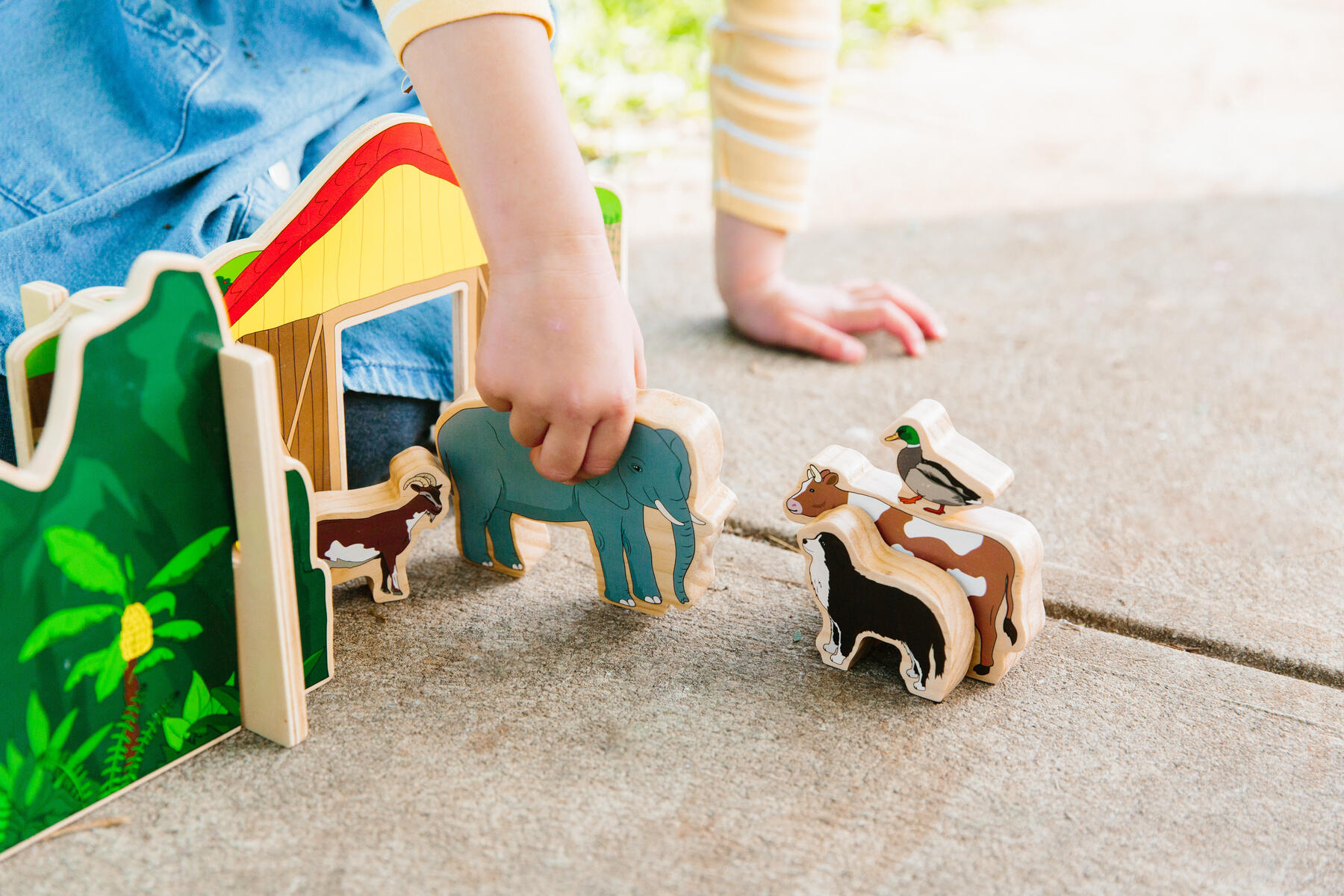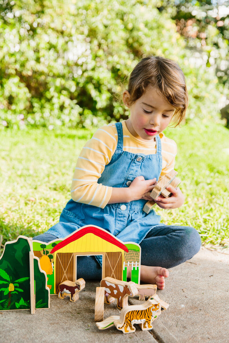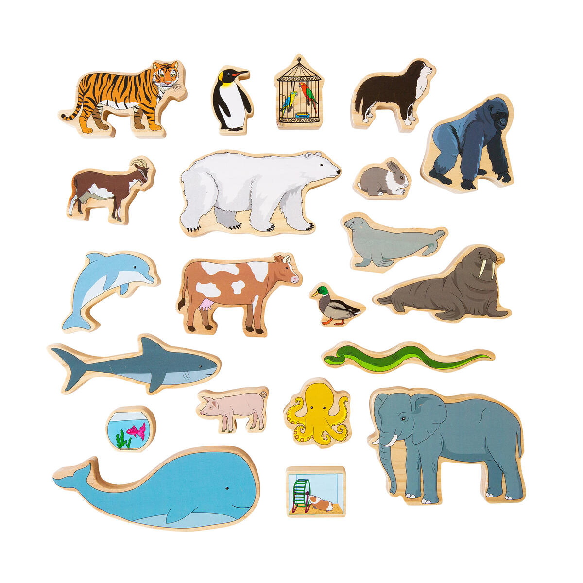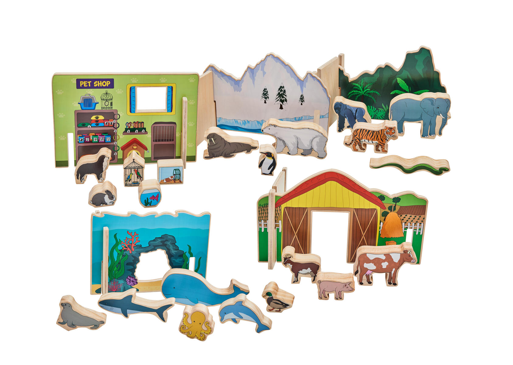 30 st/fp. Bygg ihop 5 miljöer och prata om djuren som trivs bra där. Det inkluderar de istäckta polerna, djungeln, havet, bondgården och djuraffären. Mått: Ca 30x20 (störst) 5x5 (minst). Av FSC-märkt trä. PVC-fri. Från 2 år.