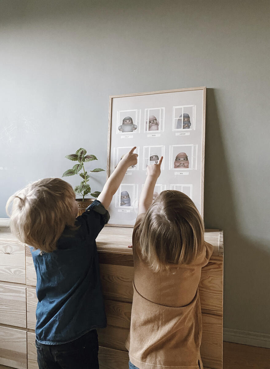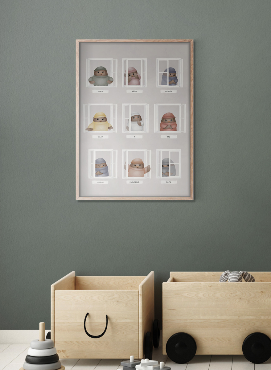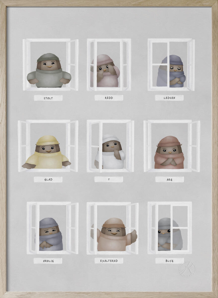 Lär barn att lära känna sina känslor med hjälp av dessa uttrycksfulla ugglor. Glad, blyg, alldeles pirrig inombords av lycka eller förtvivlat ledsen? Känslor kan vara omtumlande stora och inte lätta för barn att förstå eller prata om. När vi lär oss att sätta ord på dem så blir det ofta lättare att förstå vad det är som händer inombords. Hur pratar man om känslor hemma eller med sina kompisar? Är alla känslor tillåtna? Tavlan fångar många av de känslor som barn lätt kan känna igen sig i. Titta på den tillsammans, prata om vad ni ser - vilka känslor har hälsat på i dag, var i kroppen kände du dem? Producerad på miljövänligt, matt premiumpapper 200 g. Pappret är åldersbeständigt och märkt med EU Ecolabel och FSC. Svensktillverkat hos Svanencertifierat tryckeri. Ram eller posterhängare köps separat.