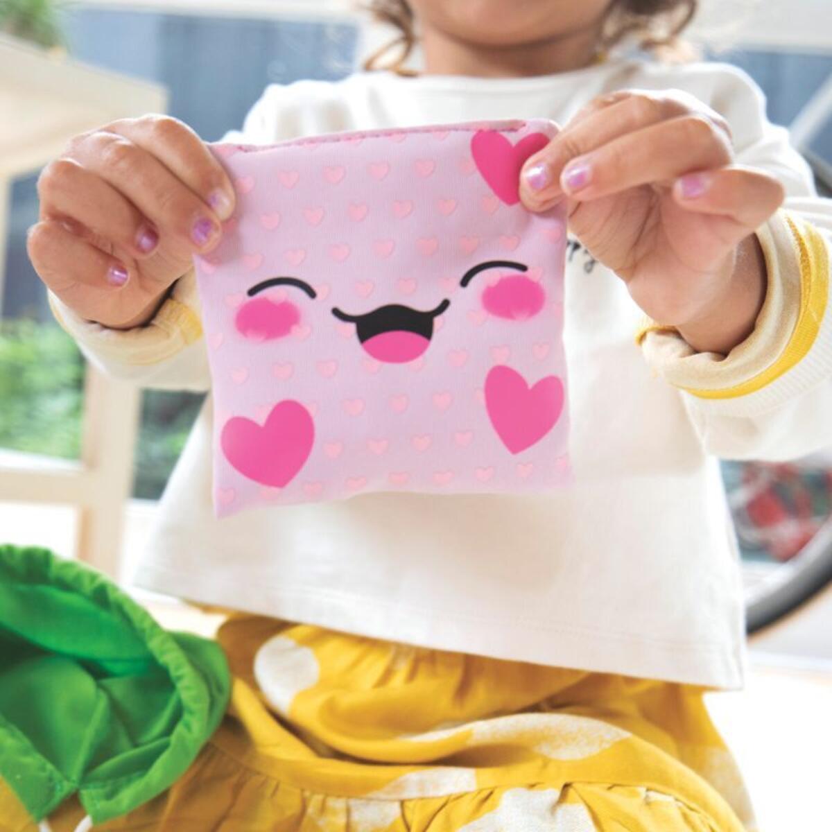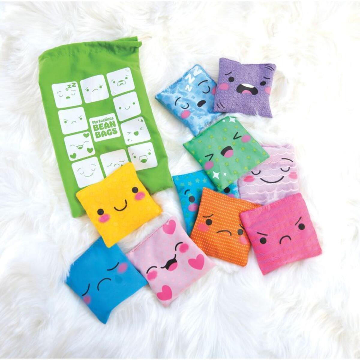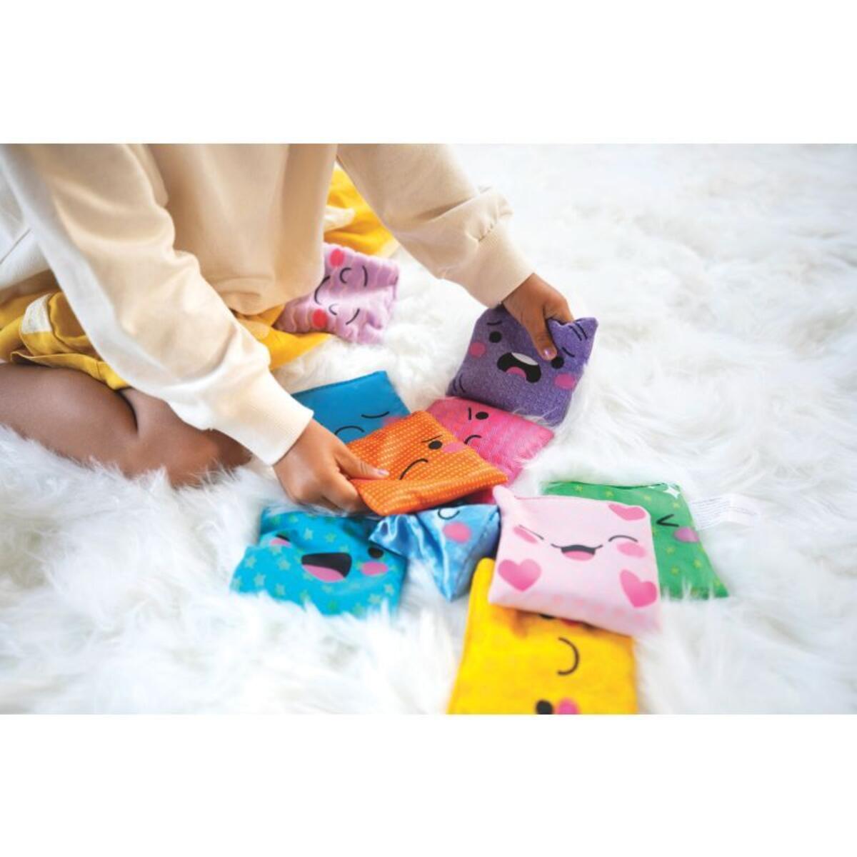 10 st. Ärtpåsar i olika tyger och olika ansiktsuttryck för att visa olika känslor: arg, besviken, glad, förväntansfull, överraskad, ledsen, trött, rädd, lugn och älskad. Mått: 10x10 cm. Från 3 år.