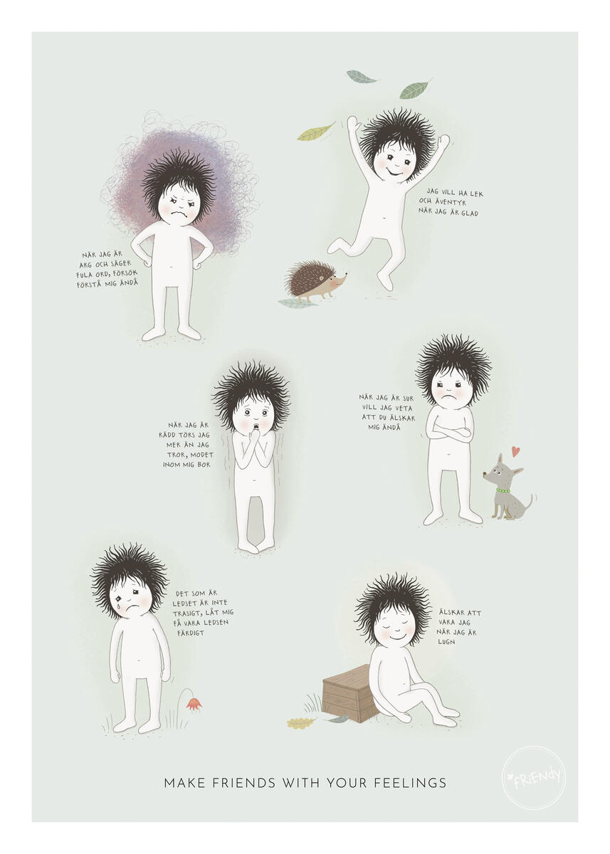Poster med känslorna glad, arg, rädd, ledsen, sur och lugn, samt kärnfulla textbudskap till både barn och vuxna. Vilka känslor har Friendy? Hur ser du det? Låt texterna inspirera till samtal. Mått: 50×70 cm.