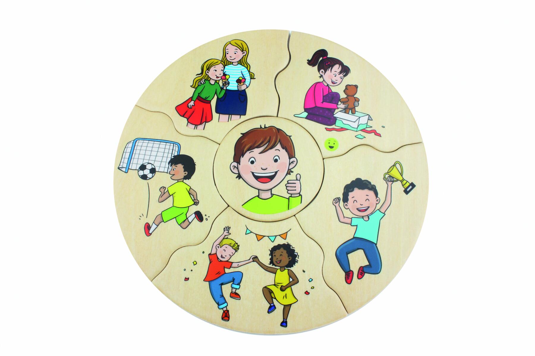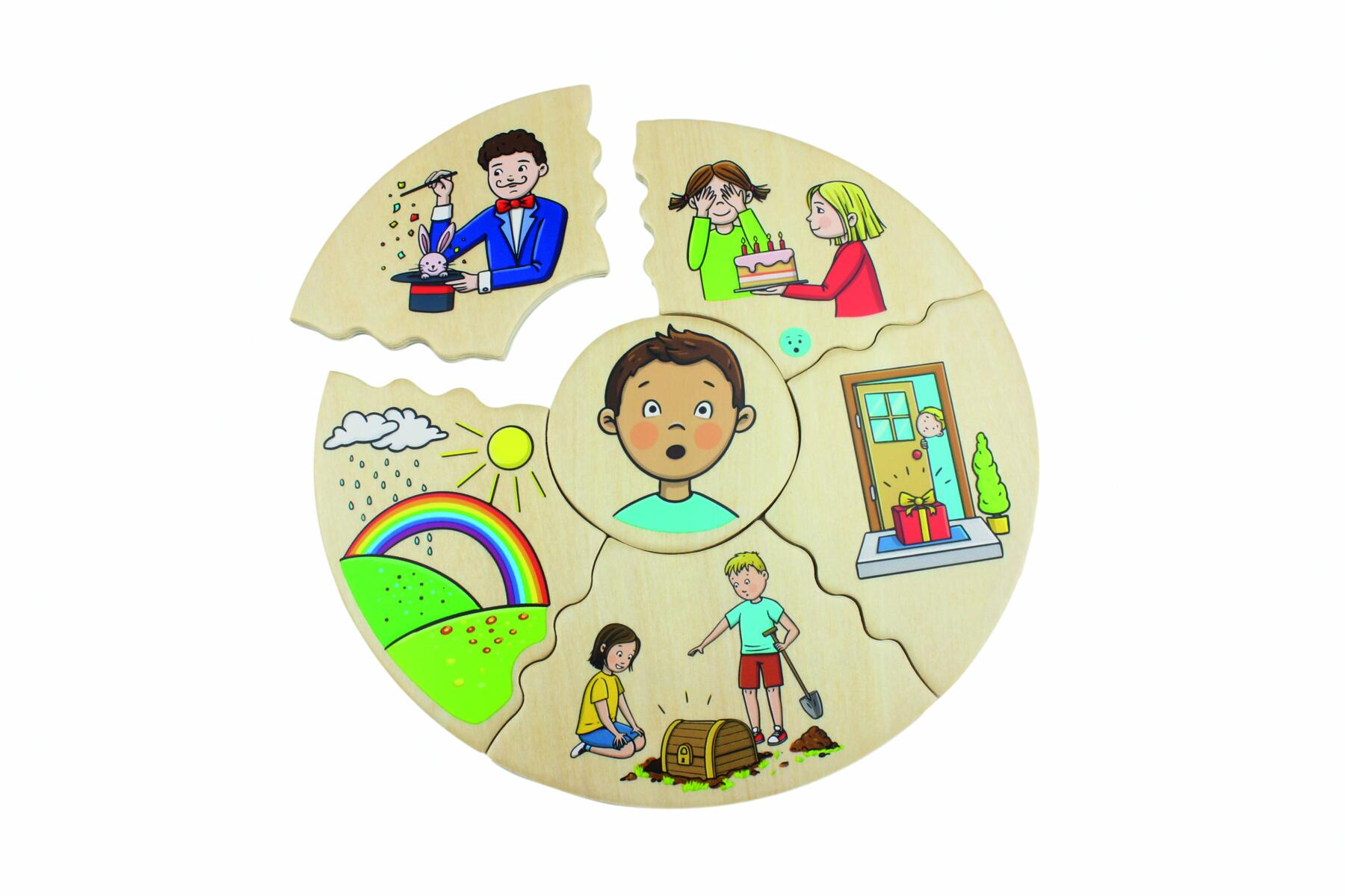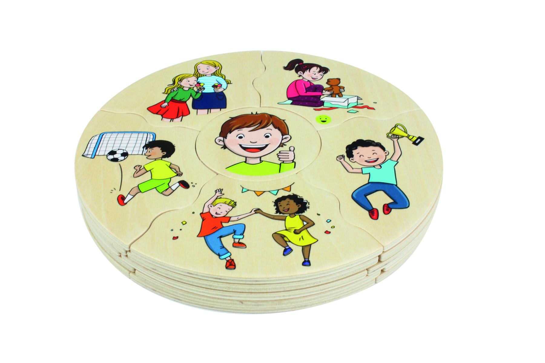 Ett roligt spel där man väljer en mittdel, vänder alla andra upp och ner och blandar dem. Turas om att vända upp brickorna för att se vem som får sin tårta klar först. I den här versionen utforskas olika känslor. Av FSC mix. Mått: 16 cm. Från 3 år.
