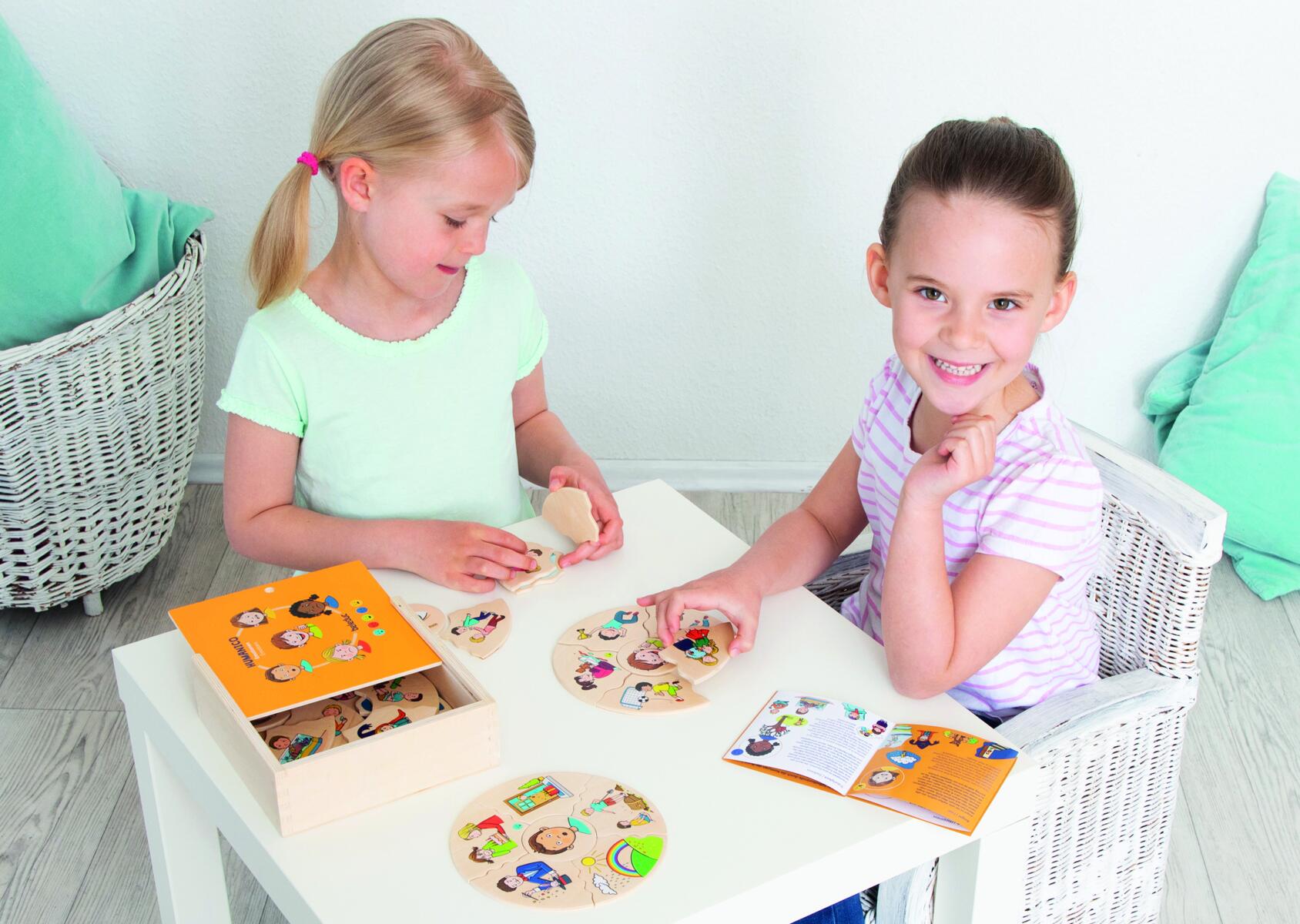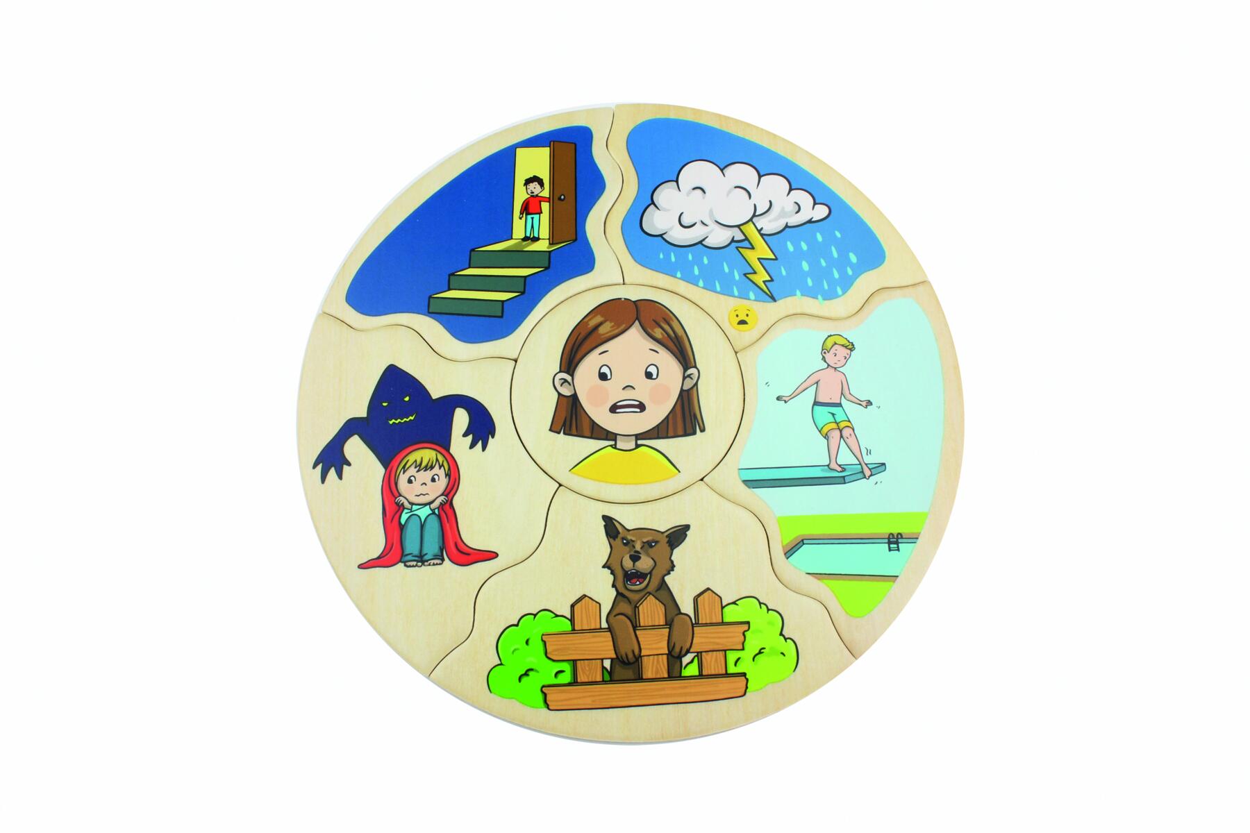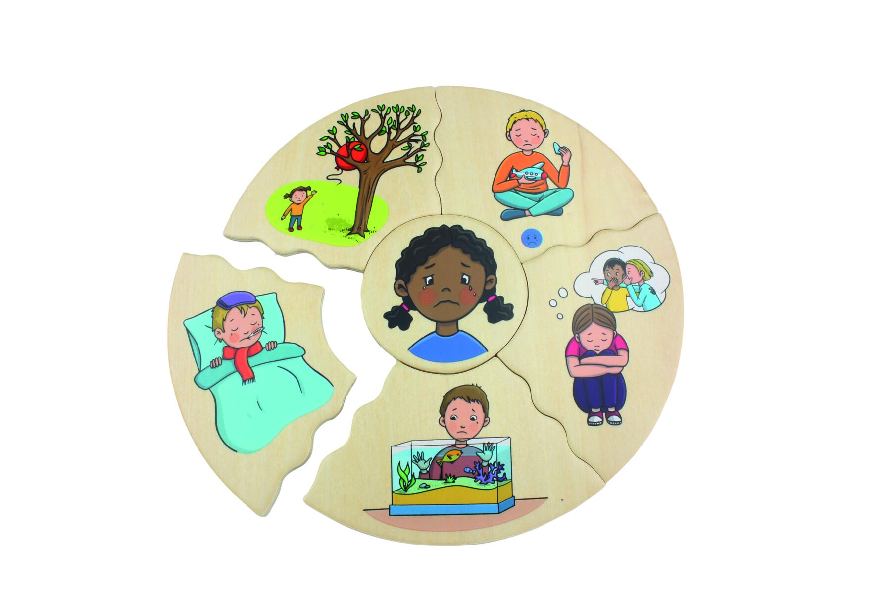 Ett roligt spel där man väljer en mittdel, vänder alla andra upp och ner och blandar dem. Turas om att vända upp brickorna för att se vem som får sin tårta klar först. I den här versionen utforskas olika känslor. Av FSC mix. Mått: 16 cm. Från 3 år.