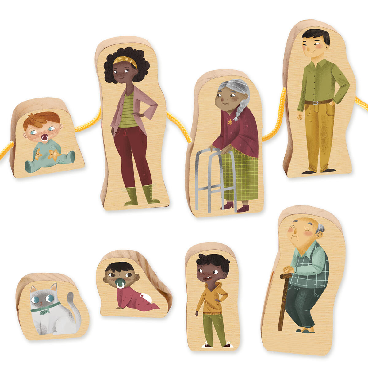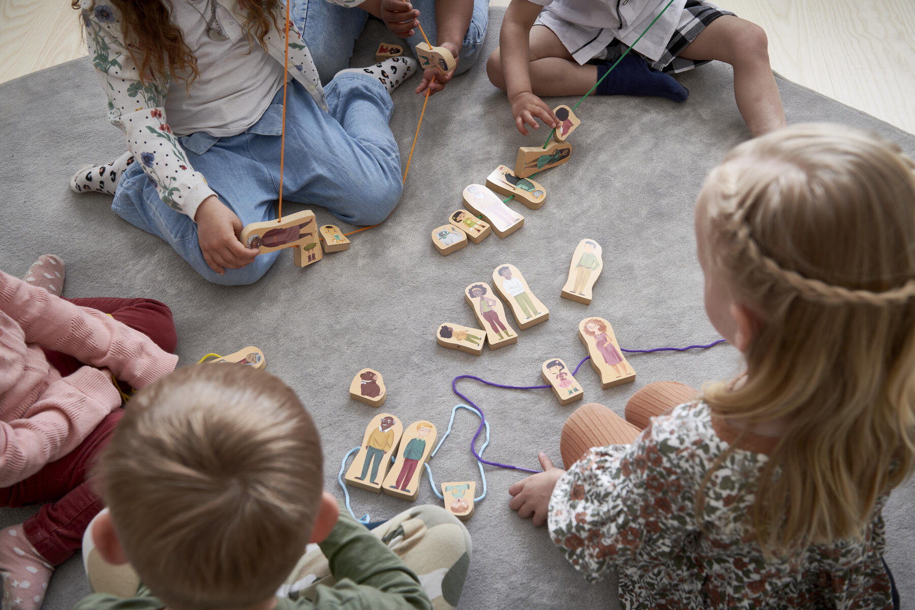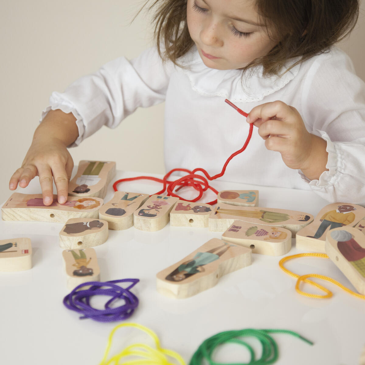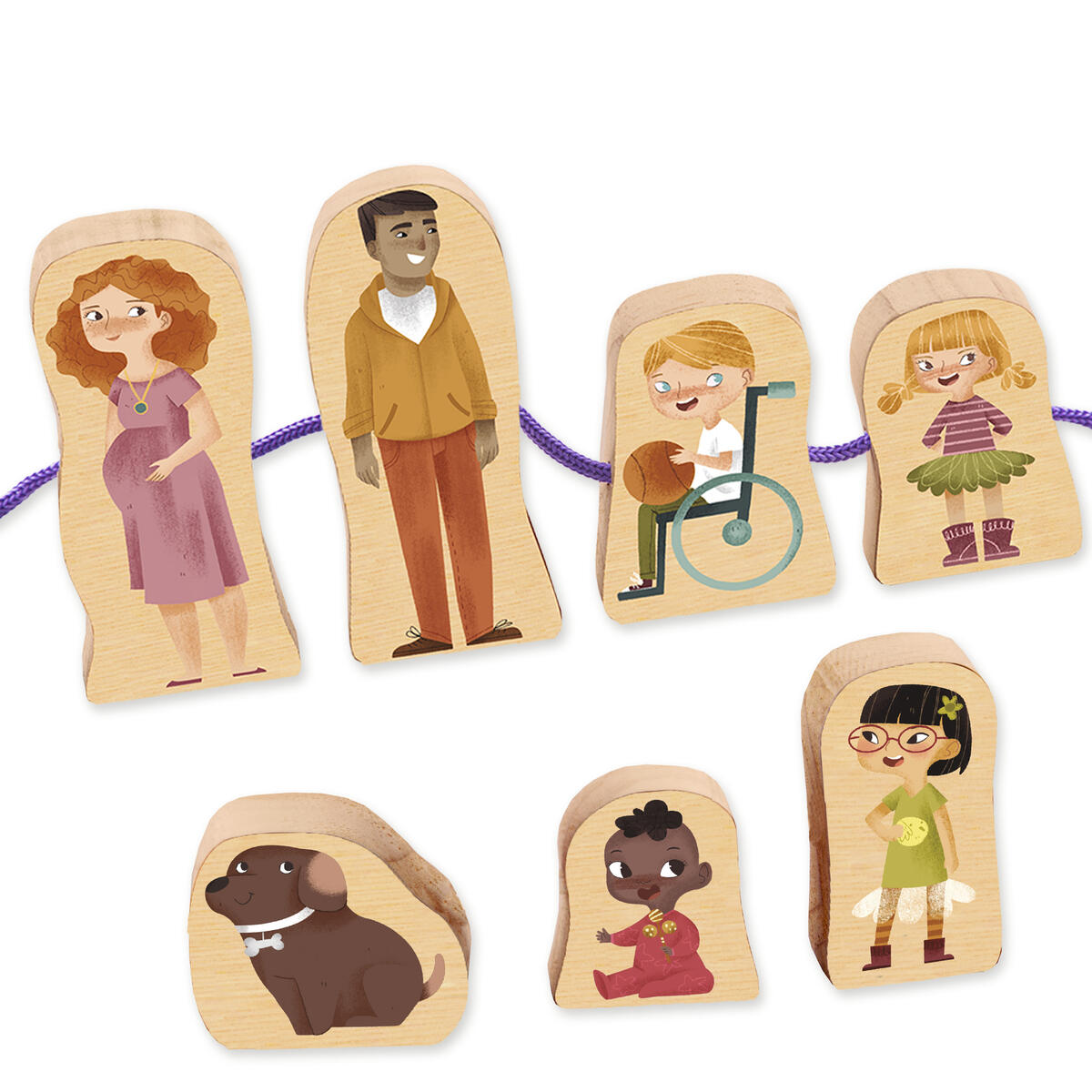 Innehåller 24 träfigurer som kan träs upp på ett snöre. Barn kan sätta samman sin egen familj och leka med karaktärerna som också kan stå. Utvecklar även finmotoriken. Kan med fördel användas i teman som inkludering och mångfald. 24 dubbeltryckta träfigurer, (mått: 11 cm höga, 1,5 cm tjocka) samt 6 snören i olika färger. PVC-fri. Från 2år.