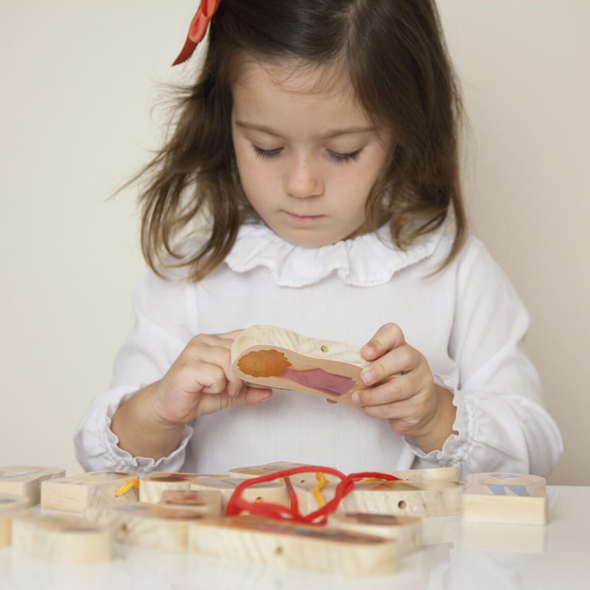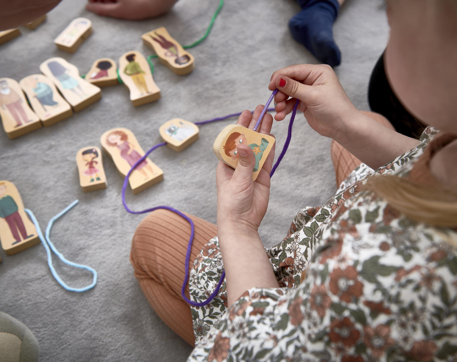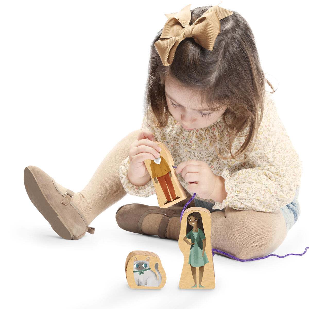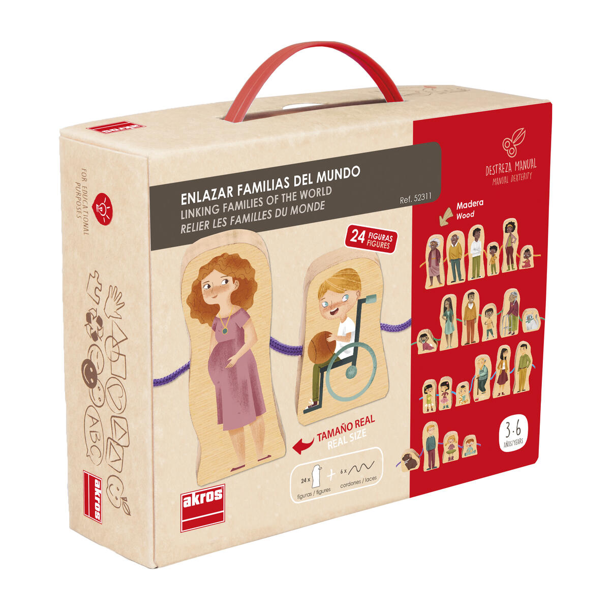 Innehåller 24 träfigurer som kan träs upp på ett snöre. Barn kan sätta samman sin egen familj och leka med karaktärerna som också kan stå. Utvecklar även finmotoriken. Kan med fördel användas i teman som inkludering och mångfald. 24 dubbeltryckta träfigurer, (mått: 11 cm höga, 1,5 cm tjocka) samt 6 snören i olika färger. PVC-fri. Från 2år.