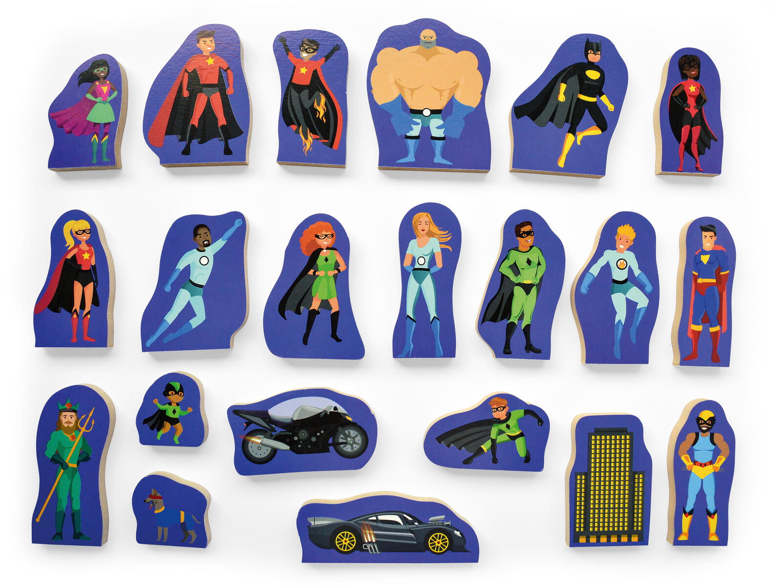 Alla har en superhjälte inom sig! 21 stadiga träfigurer med en person eller sak på ena sidan och deras alterego som superhjälte på andra sidan. Mått: 20x15x15 cm. Av FSC-märkt trä. PVC-fri. Från 1 år.