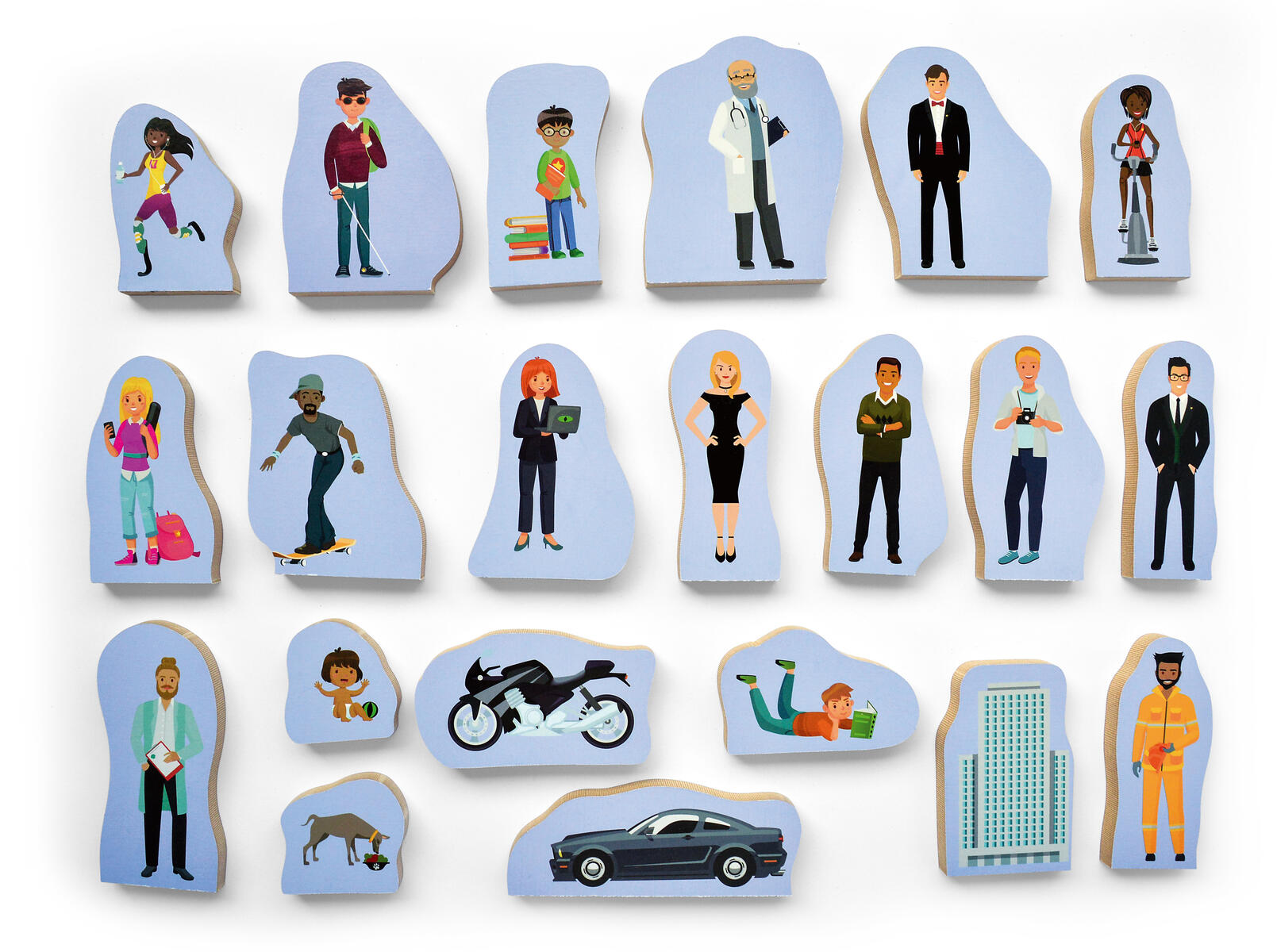 20 stabila träfigurer som visar olika samhällsmedborgare. Hitta på en spännande historia som utspelar sig i just din stad eller by. Mått på figurerna: ca 20x15 cm. Av FSC-märkt trä. PVC-fri. Från 1 år.
