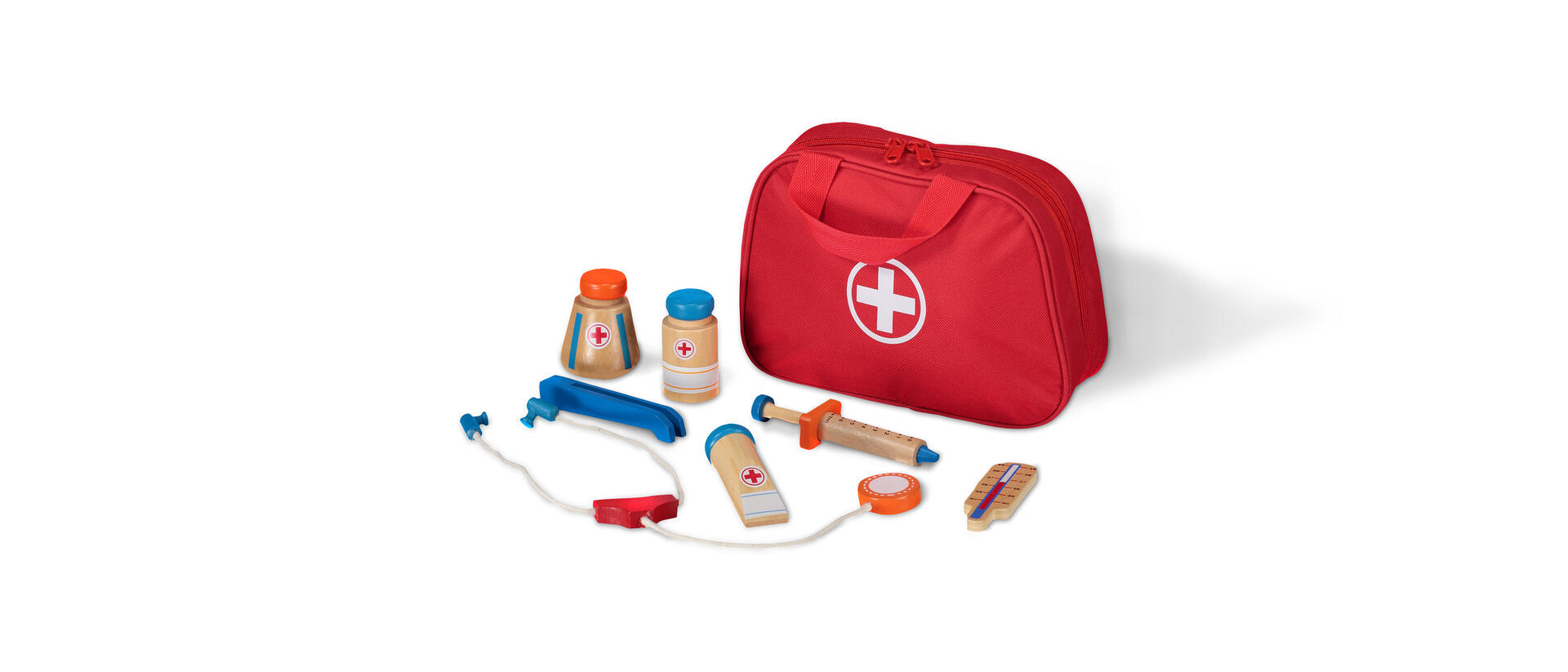 En doktorsväska med åtta instrument av FSC-märkt trä. Idealisk för rollekar och för att avdramatisera läkarbesök. Mått på väska: 20x8x14 cm. PVC-fri. Från 3 år.