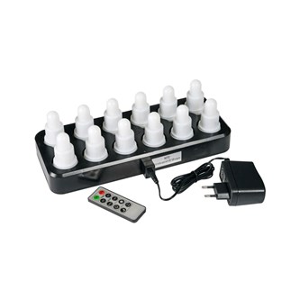 Set med 12 laddningsbara LED-ljus. Levereras med laddningsplatta, en adapter och en fjärrkontroll. Med fjärrkontrollen kan även ljusnivån justeras. Brinntid ca 13 tim. Ljusen ger ett varmvitt sken. Fjärrkontrollen kräver knappcells-batteri av typen CR2025. Laddningsplattan har uppladdningsbart litiumbatteri. Laddningstid ca 8 tim. Mått på ljus: 6,5x4 cm.