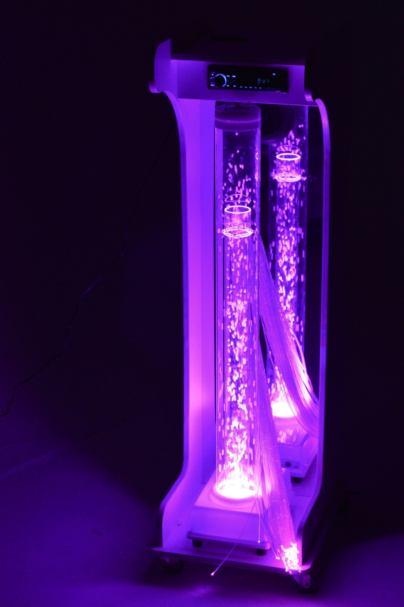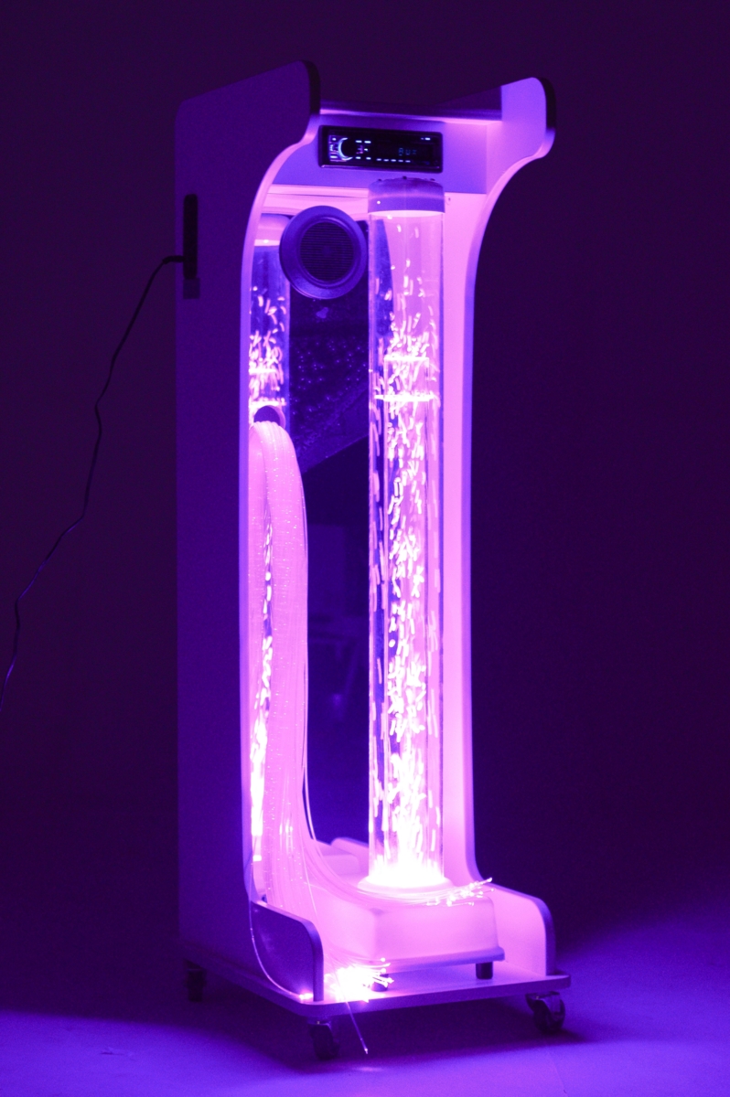 Ett rullande sinnesrum som innehåller ett miniluftrör, fiberoptik med 100 trådar samt en musikanläggning som kan spelas via Bluetooth. Med en knapppanel på sidan väljs vilken ljuseffekt man vill skall vara aktiv. Kan lätt rullas mellan rum och salar. Mått: B41xD51xH122 cm. Ansluts med transformator.