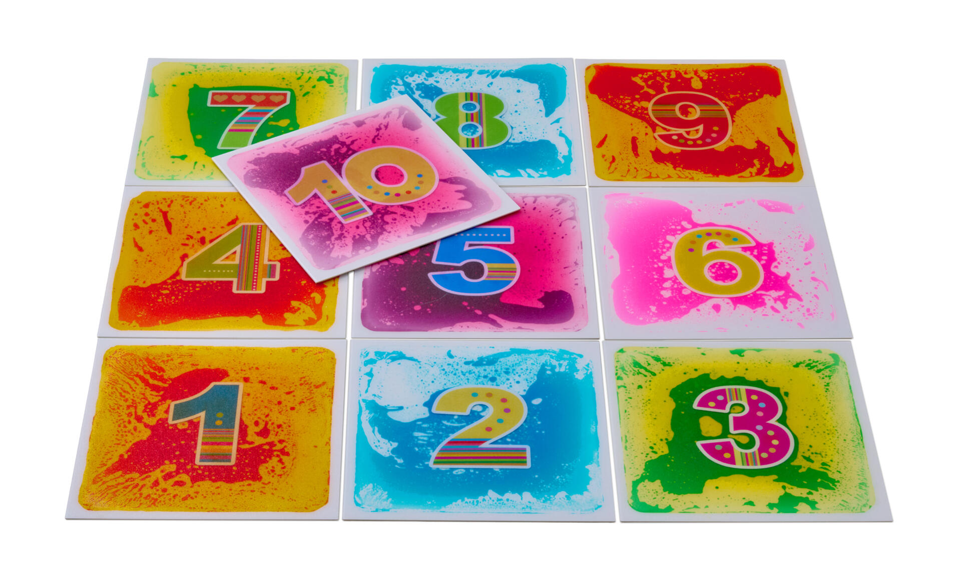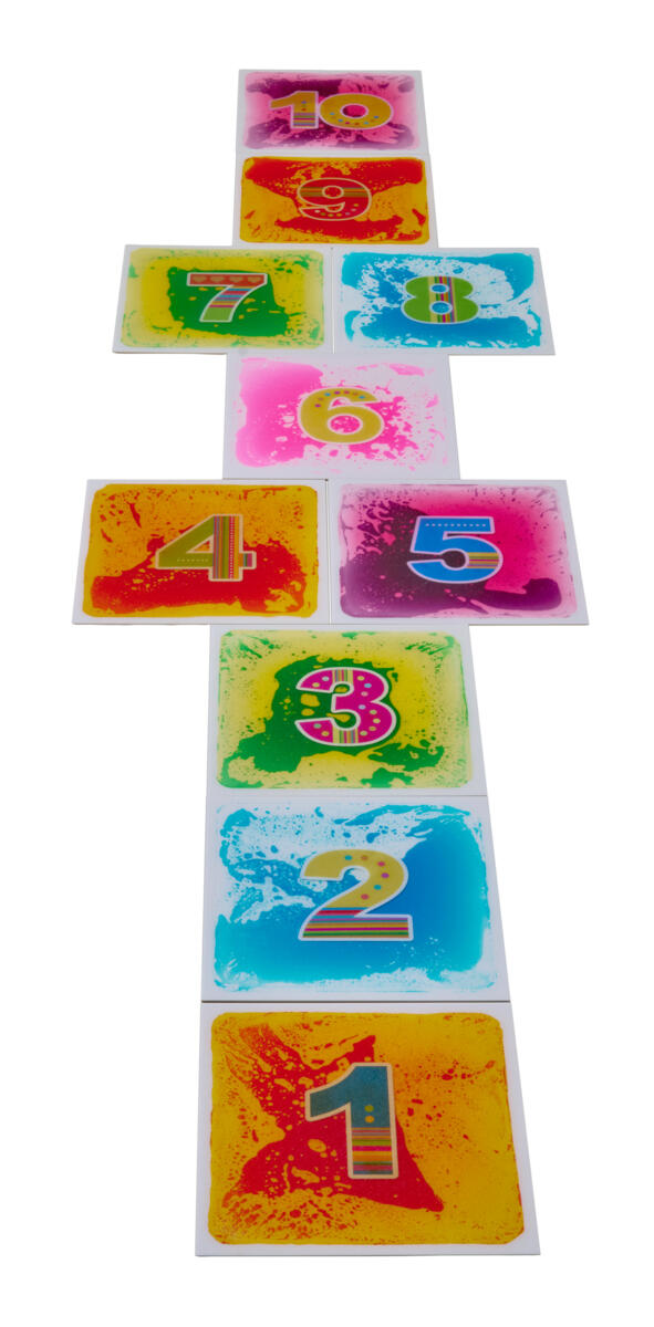 10 sensoriska vätskefyllda golvplattor med siffrorna 1-10. En underbar visuell och taktil upplevelse som uppmuntrar till rörelse och upptäckarglädje. Vätskan inuti skapar föränderliga mönster vilket lockar till att röra, trycka och hoppa. Mycket tåliga. De klarar även att köras på av t.ex. en rullstol. Plattorna kan även användas på ett bord. Det minsta tryck skapar en dramatisk visuell effekt. Mått: 40x40 cm.