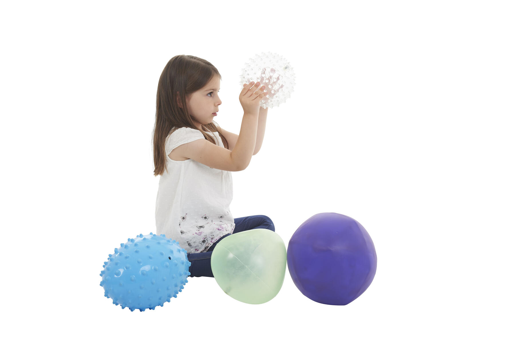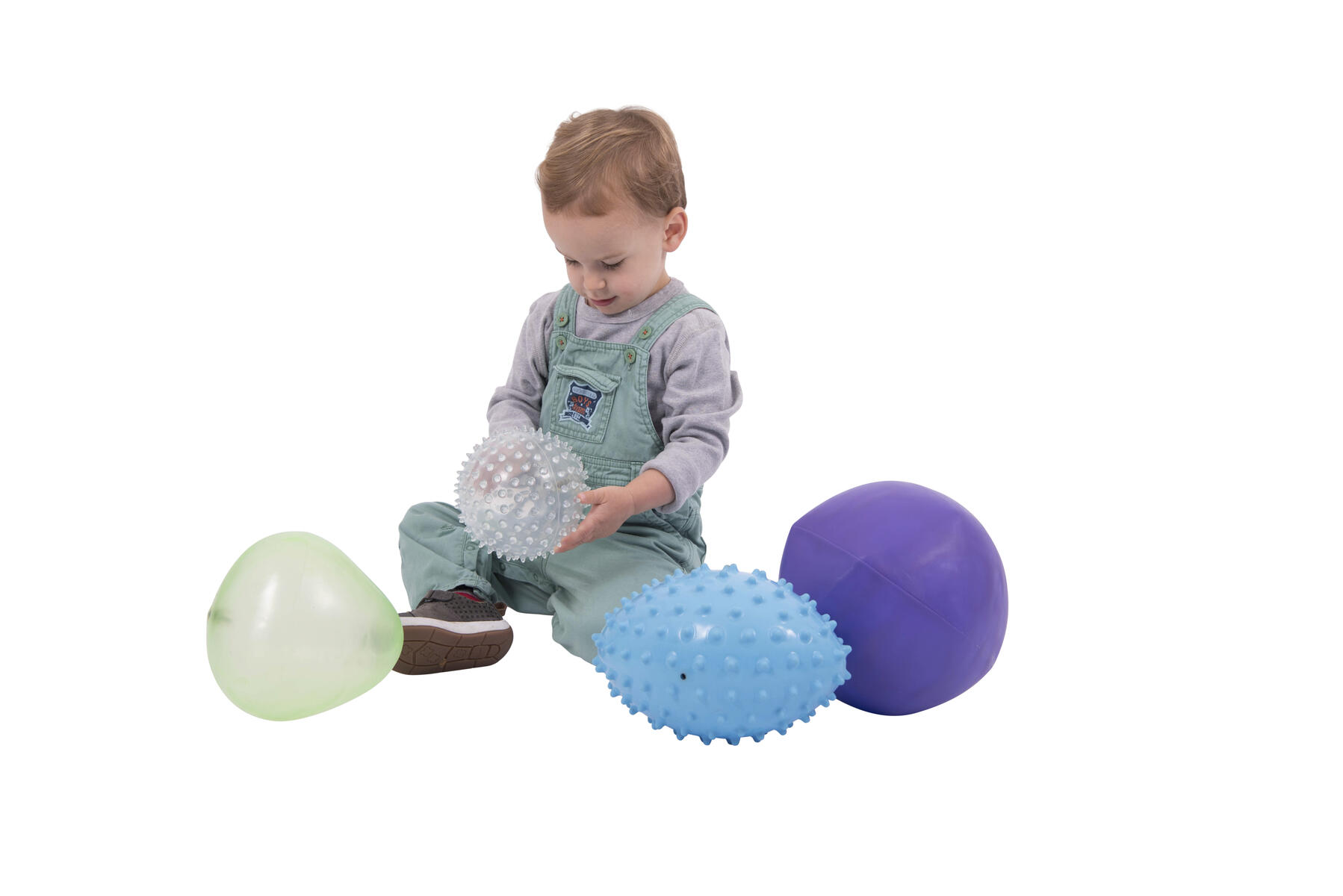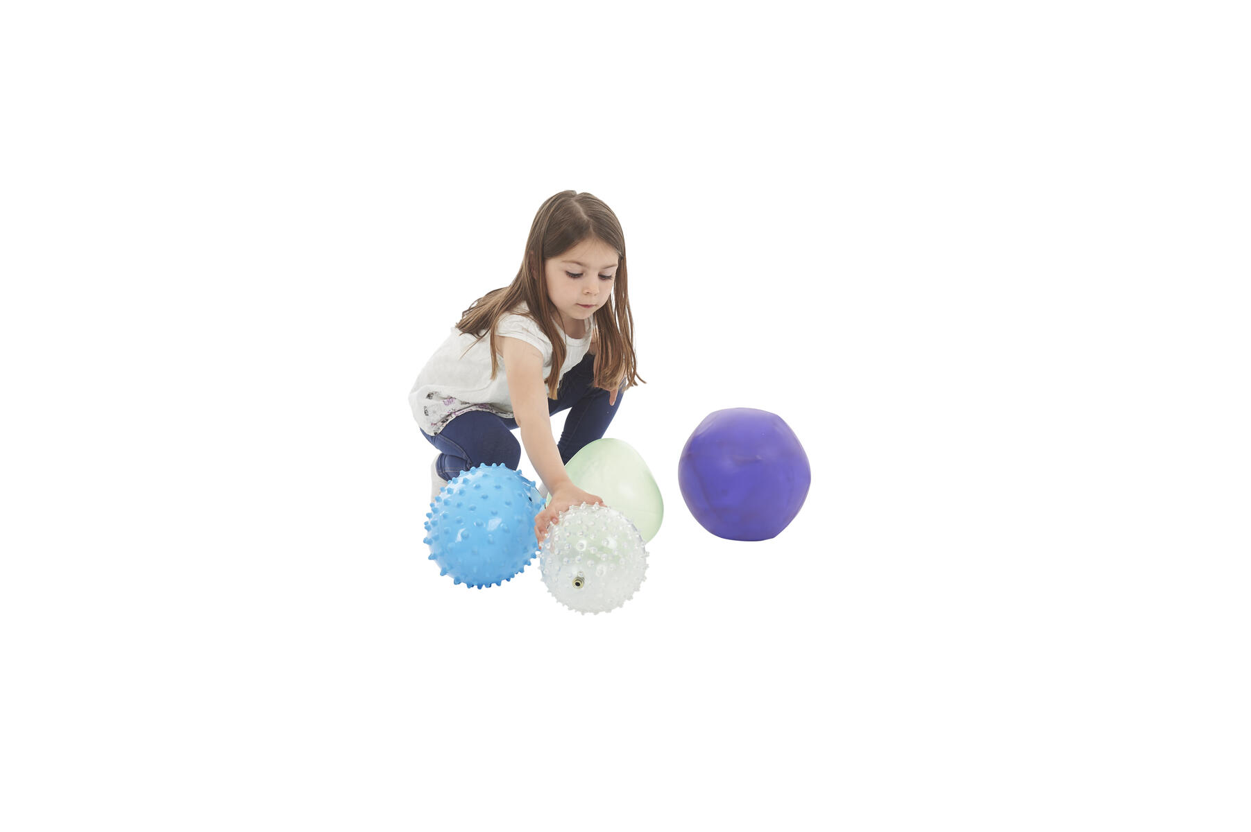 4 st. Ett set med fyra uppblåsbara bollar i ovanliga former och med olika ytstrukturer och färger. Jättekul att kasta, fånga, rulla och studsa eftersom de oregelbundna formerna får dem att röra sig i oförutsägbara riktningar. Utvecklar öga-handkoordinationen. Av ftalatfri PVC. Mått: ø 15-25 cm. Från 3 år.