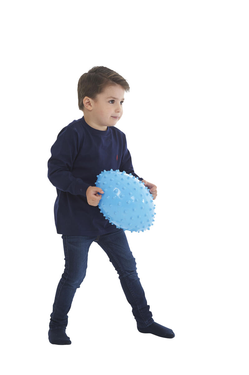 En tvåfärgad rugbyformad boll som är lätt att hålla men den taktila ytan med mjuka knoppar gör att den studsar åt olika håll varje gång. Rolig, taktilt stimulerande och blinkande. Den blir extra rolig i ett mörkt rum. Aktiveras vid hantering. Mått: 12x8 cm. Av TPR. PVC-fri. Från 3 år.