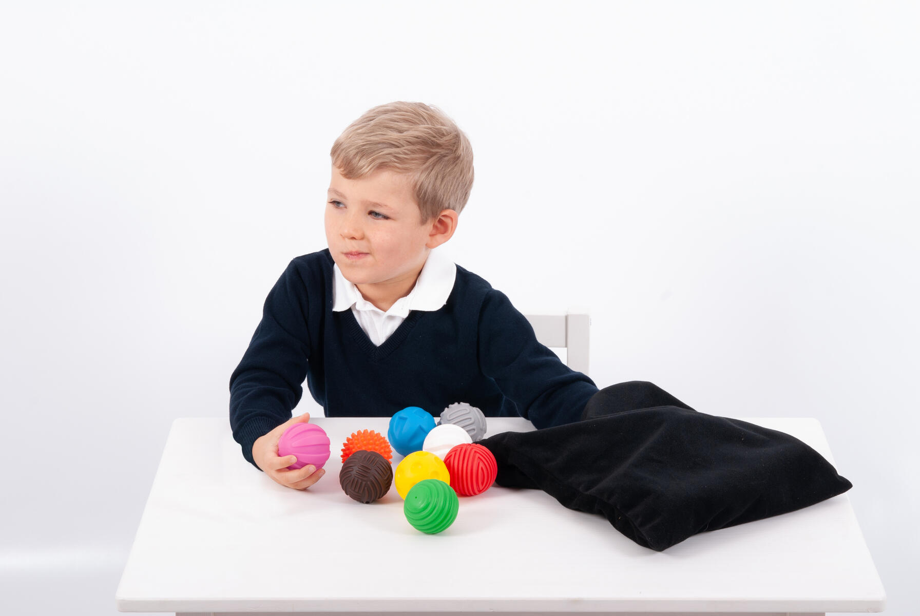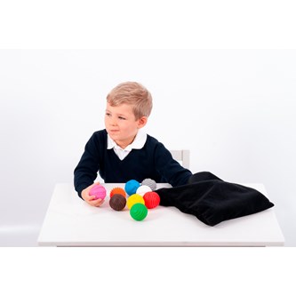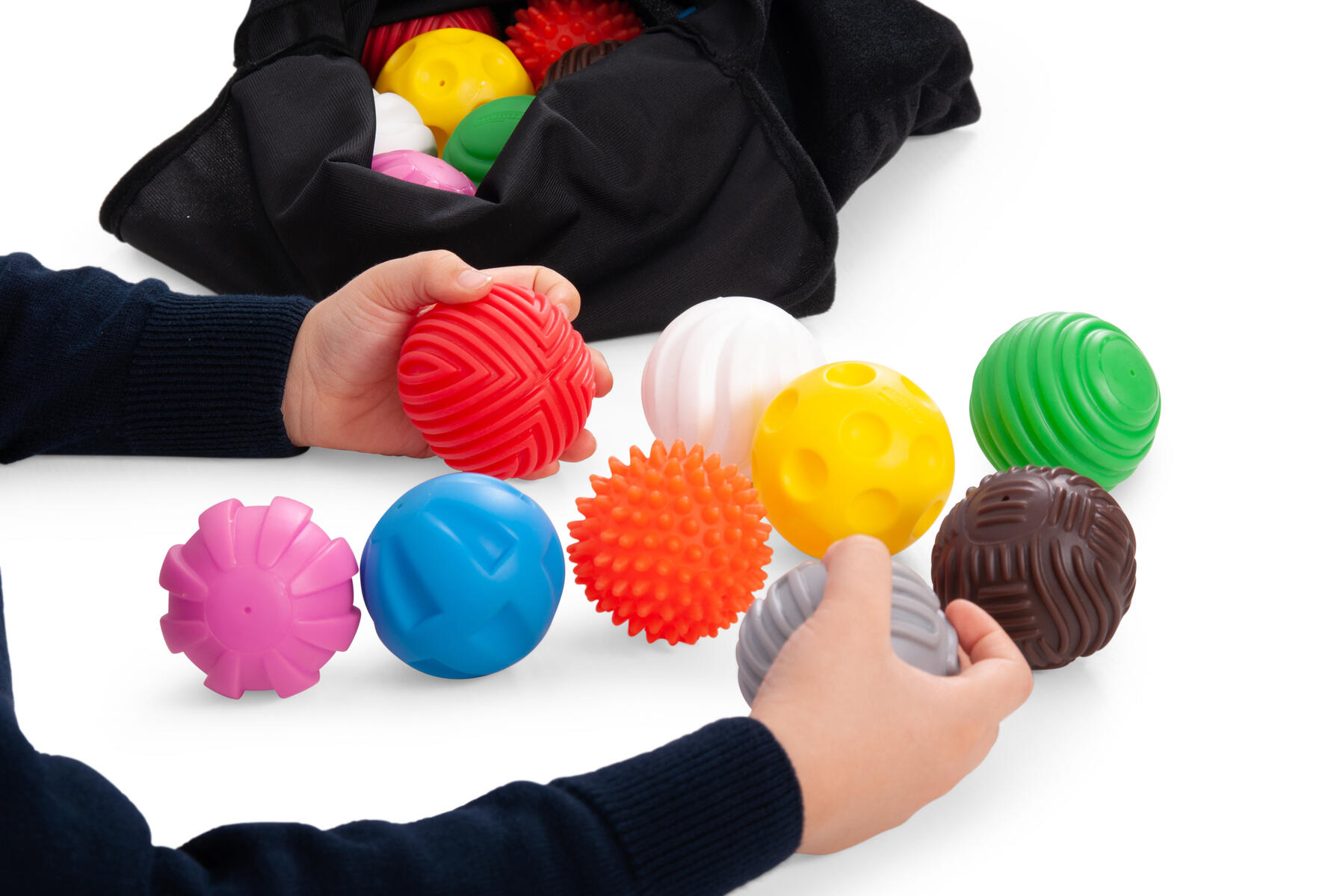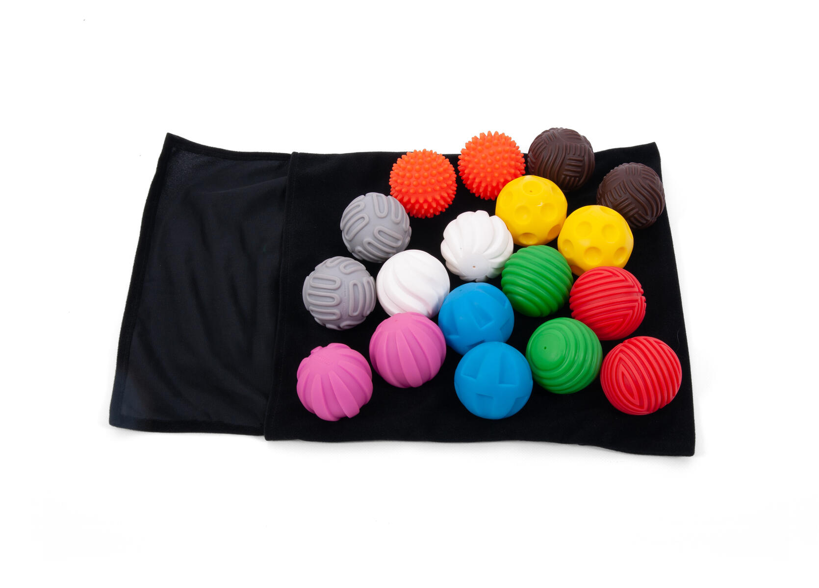 Ett sensoriskt aktivitetsset som innehåller 9 bollpar med olika taktila ytor. Stoppa bollarna i den mjuka påsen och låt barnen turas om att känna och försöka hitta matchande bollar. Barnen kan även träna sortering, mönster, beskriva texturer och färger. Bollar av TPR. PVC-fri. Från 1 år.