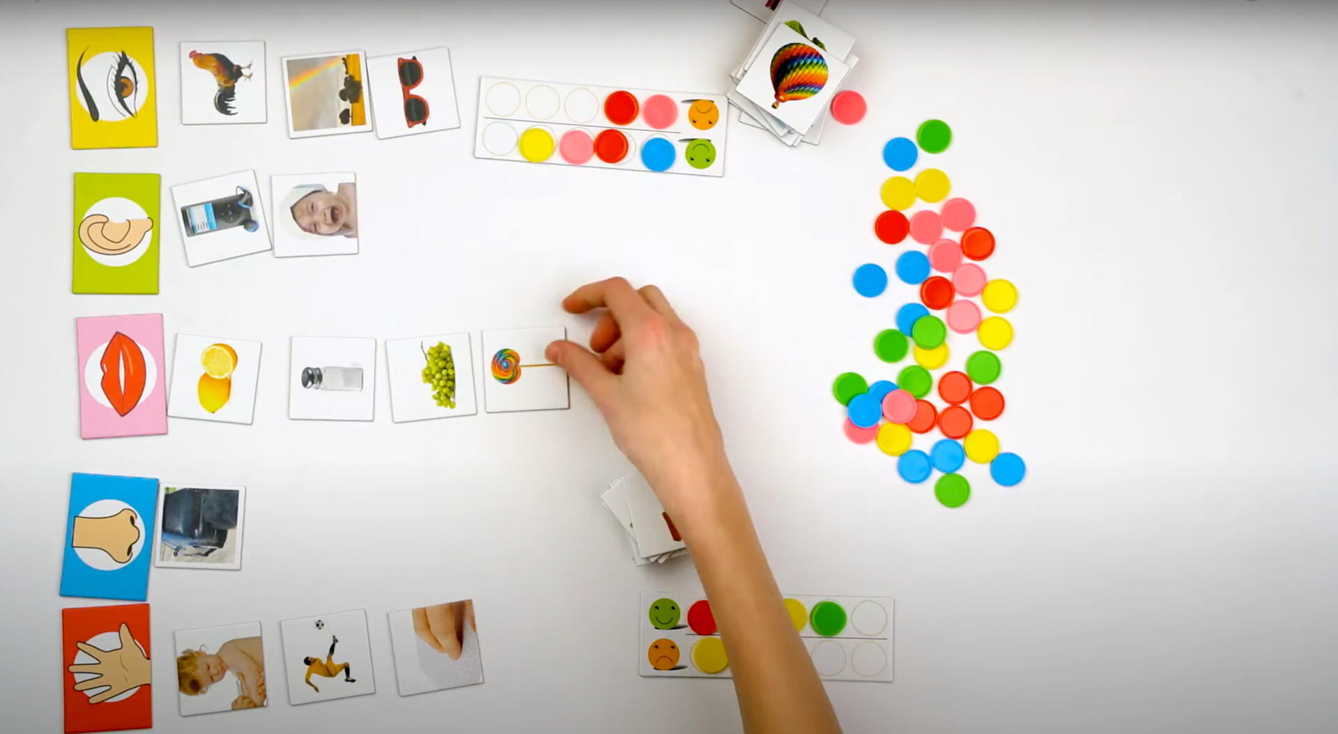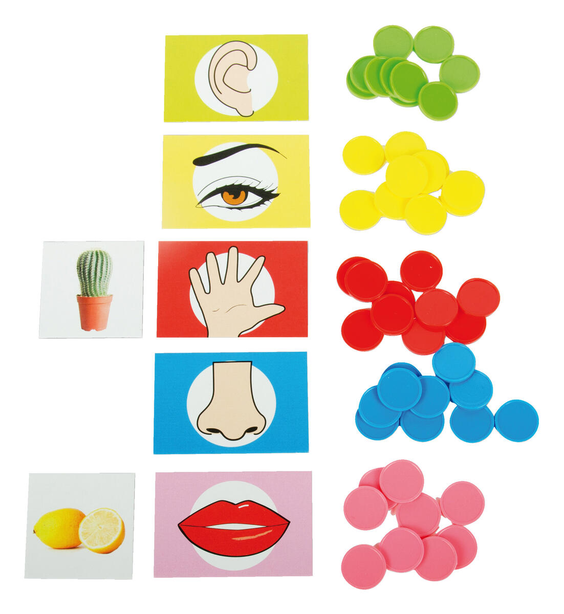 Kombinera sinnen och känslor. Barnen upptäcker sina olika sinnen och vilken information vi får från dem. När de spelar lär de sig att alla kan uppleva lukt eller smak olika. Vilka bilder passar till vilket sinne? För 2-6 spelare. PVC-fri. Från 4 år.