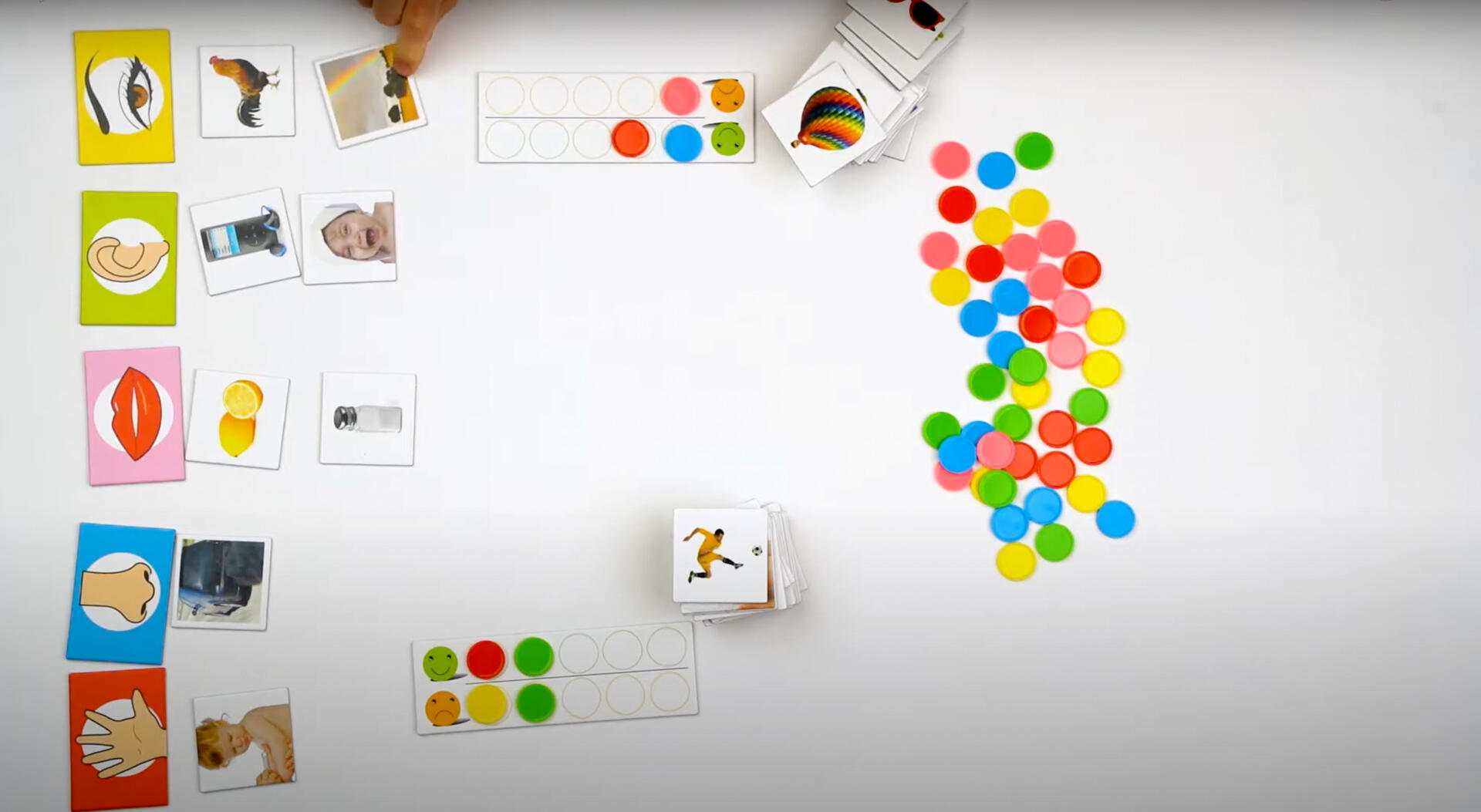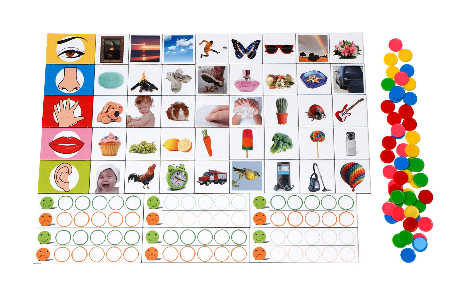 Fyra spel i ett! Ett språkspel där man med hjälp av foton observerar och beskriver upplevelser, vilka sinnen som används o.s.v. Ett sorteringsspel där man sorterar foton efter de olika sinnena och matchar efter upplevelsen. Två lottospel. För upp till 5 deltagare. PVC-fri. Från 4 år.